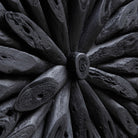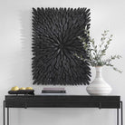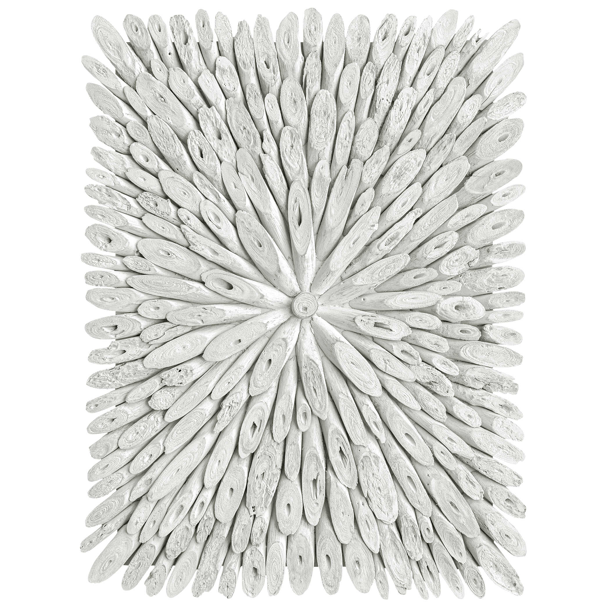This wood wall panel is an organic contemporary piece of décor handcraft from individual cut driftwood pieces in a whitewashed or black finish, artfully arranged in a striking sunburst pattern. May be hung horizontal or vertical.