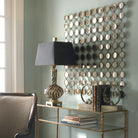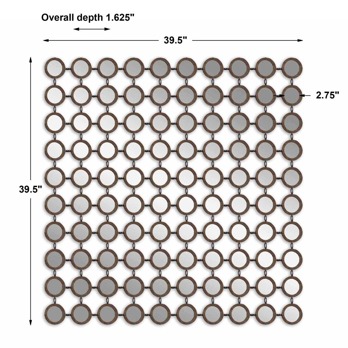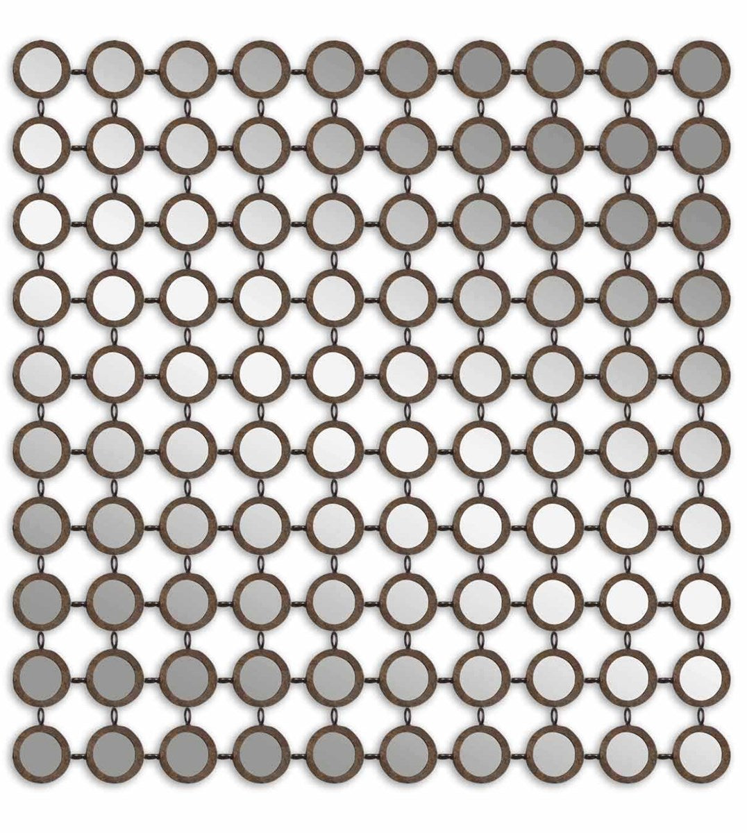 Numerous, small round mirrors are joined by hand forged metal to create the Dinuba mirrored Wall décor. Finish is lightly antiqued silver champagne leaf, this wall décor marries art and the reflective qualities of a mirror. Use it any place you need more light or want to reflect the surroundings.