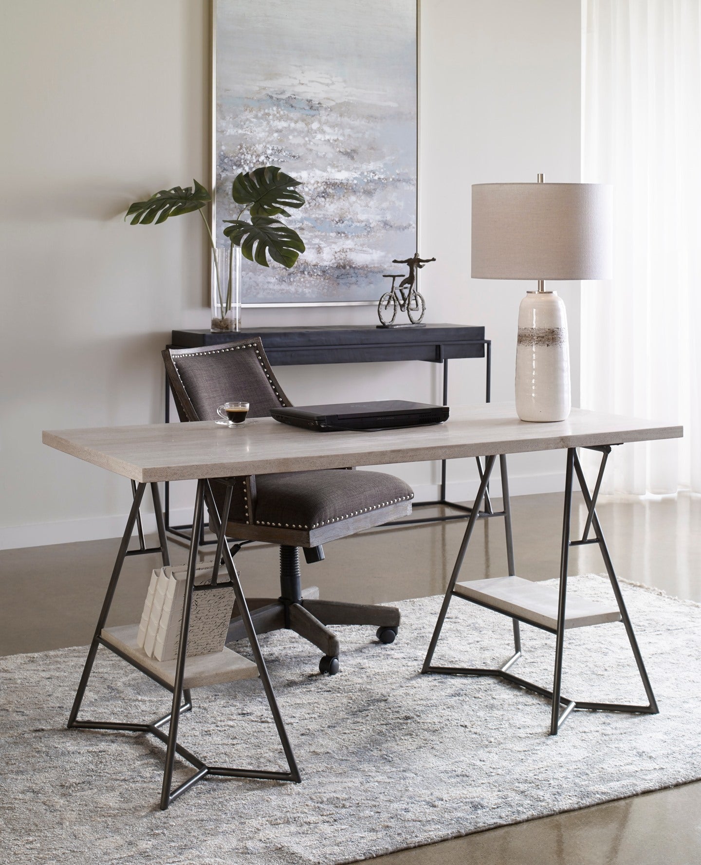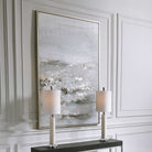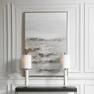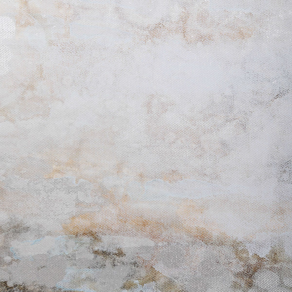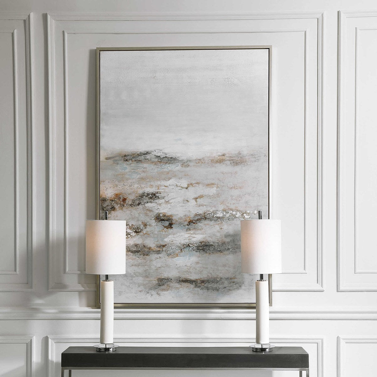 A fresh take on modern abstract paintings, this hand painted canvas art showcases a neutral color palette with brown, taupe and white tones accented by pops of light blue. The "Open Plain" canvas artwork is complemented by a silver gallery frame. Due to the handcrafted nature of this artwork, each piece may have subtle differences.
