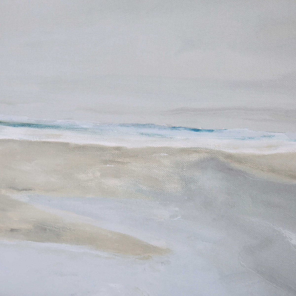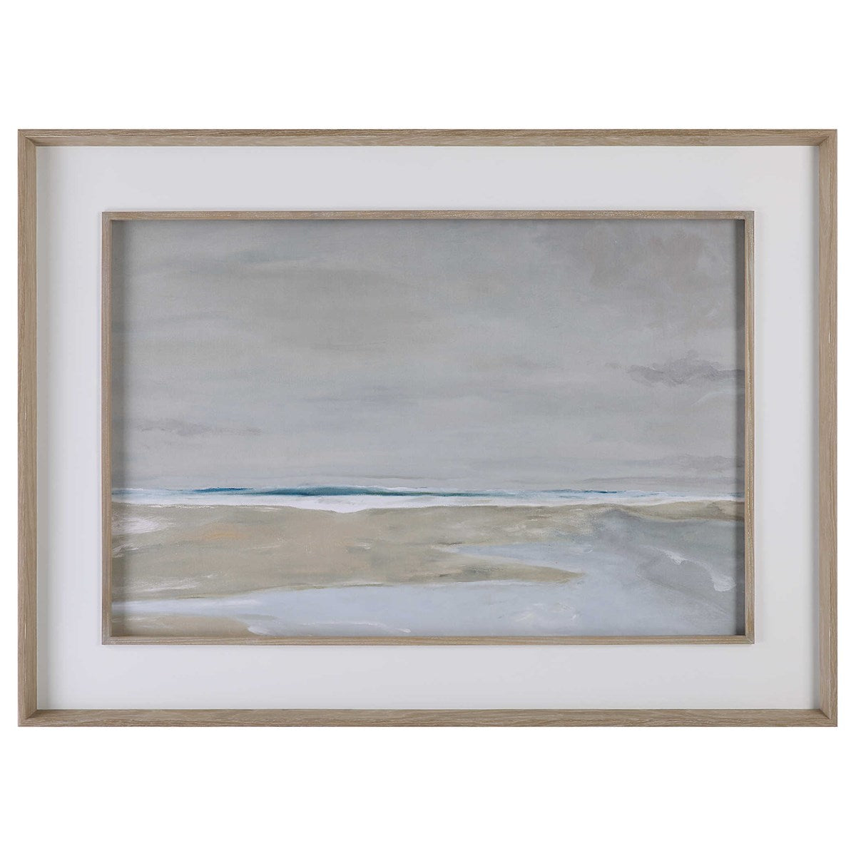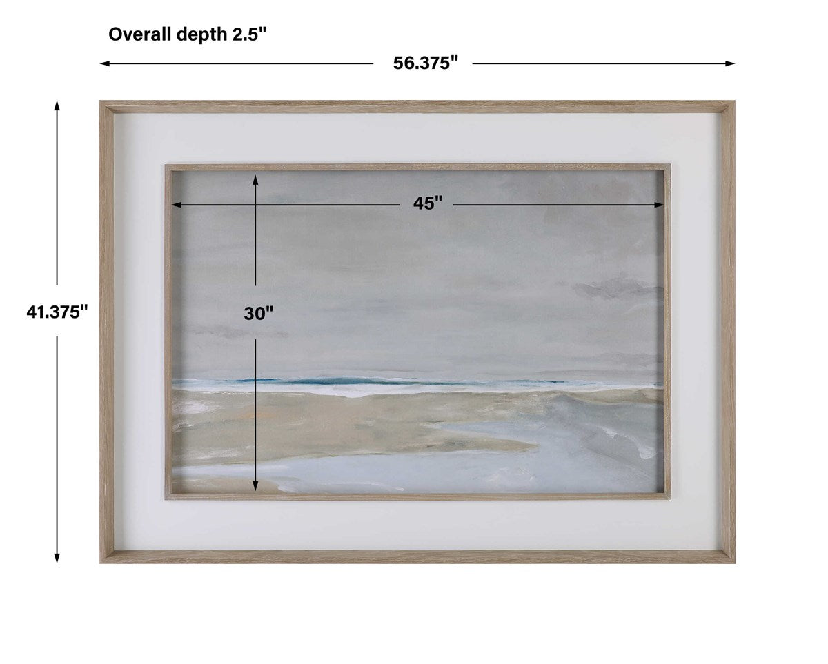 This artwork titled, "Oregon Coast", paints a picturesque contemporary vision of the Oregon shoreline. Surrounded by a naturally finished pine wood frame and fillet (interior raised border) with a satin white mat; this image is serine in both tone and composition. Printed on paper with special matte finish. Ready for installation with 2 D-Rings. Artwork by Rob Delamater.