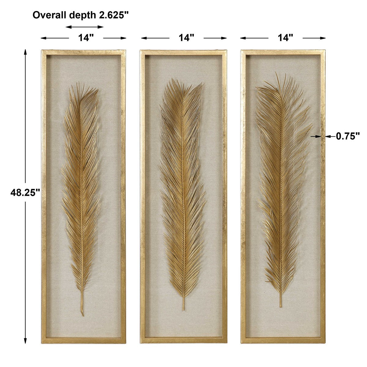The set of 3 Palma Wall Art features gold finished Sago palm leaf replicas, set on a neutral linen background with hand applied gold leaf shadow box frames. Provides an organic, chic focus. Priced and sold as a set of 3.