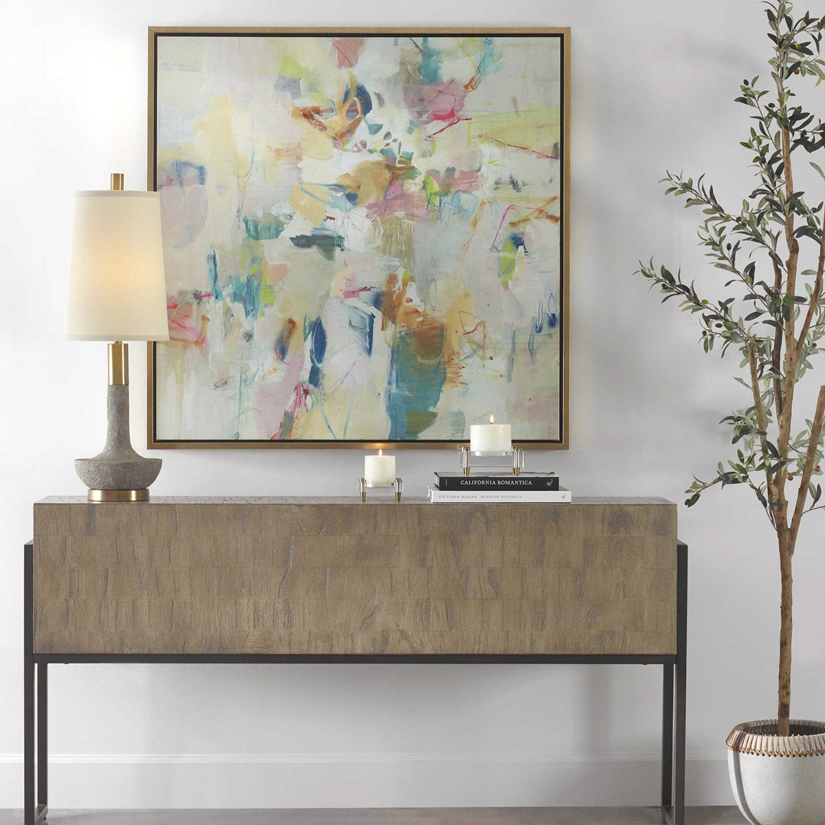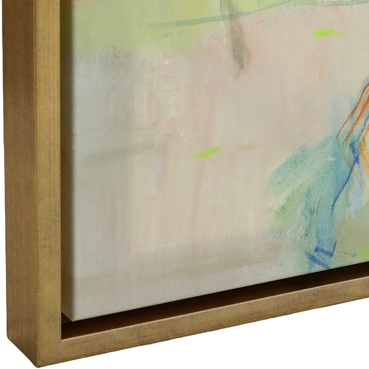 Showcasing a striking blend of bright and neutral color pallets, The "Party Time" giclee giclee (pronounced “zhee-clays”) on canvas is surrounded by a solid wood frame with gold finish. Giclee is a French term meaning “to spray”, referring to how these prints are usually produced resulting in a high-quality print. This piece may be hung horizontal or vertical. Each canvas is proudly handcrafted and printed in the USA. Artwork by Lisa Ridgers.