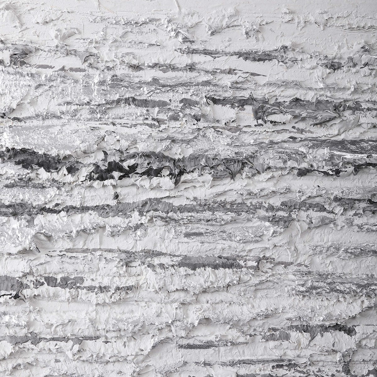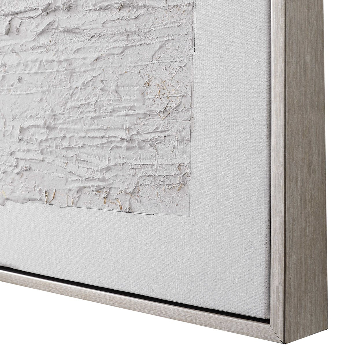 Stylish and sophisticated, the hand painted "Stardust" has noticeable textural accents with light gray, charcoal and silver leaf tones working together to create the perfect contemporary artwork. A white border within the canvas and silver gallery frame accent the piece. Due to the handcrafted nature of this artwork, each piece may have subtle differences. Hardware hangs vertically.
