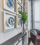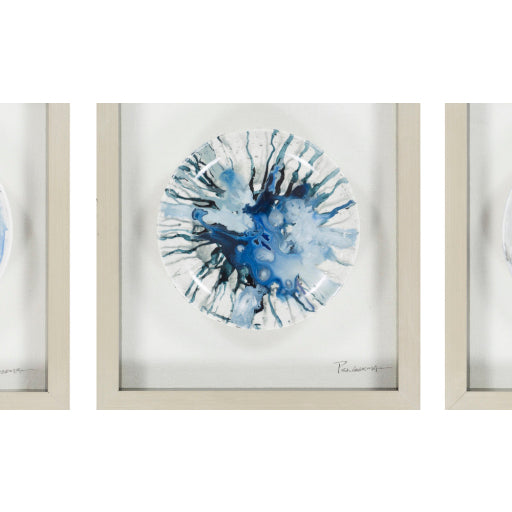 The Stella Wall Art Set showcases 1 of 3 unique ceramic plates in a freeform rainbow of blues with metalic accents. Each framed in a coordinating shadowbox. Hang as a group for impact. Ready for hanging