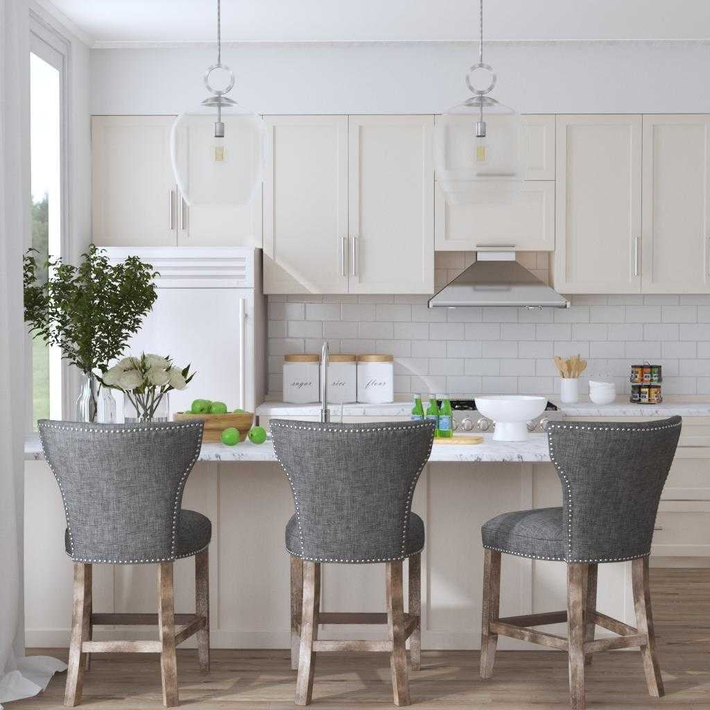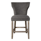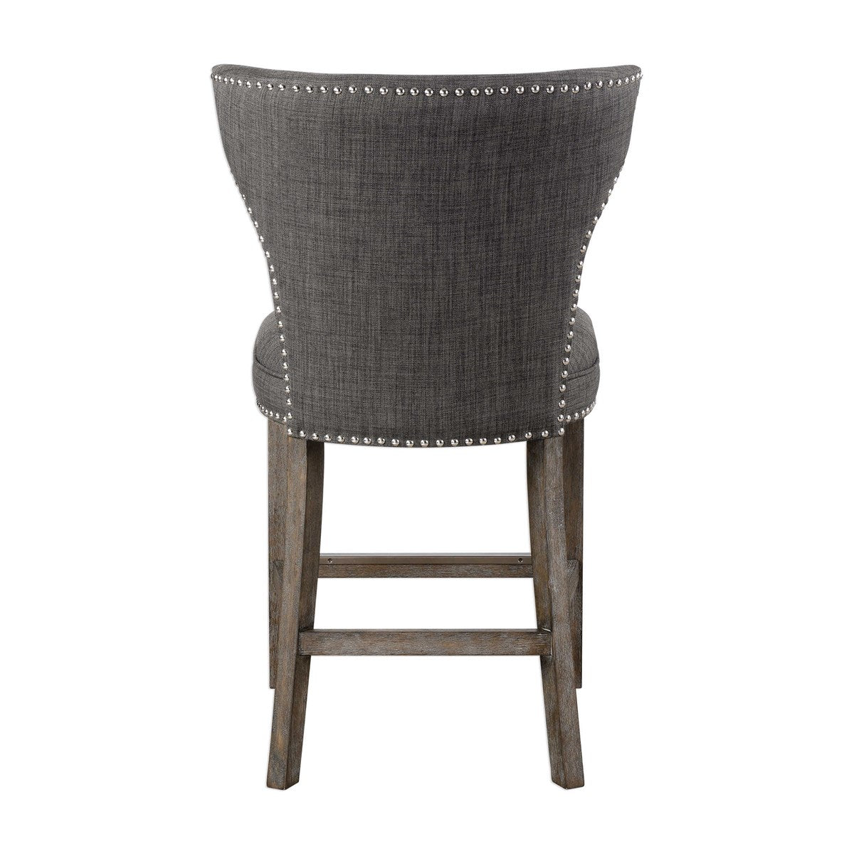 The Arnaud Counter Stool provides supportive comfort in a curved back design, covered in a warm charcoal grey linen and accented by polished nickel nail head trim. A honey-stained wood frame is finished with heavy grey wash, with an antique brass finished kick plate.