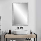 The iron frame of the Serena Vanity Mirror features a spindle style beaded profile finished in either satin black or white. This mirror harkens back to a classic style that still looks contemporary today. May be hung horizontal or vertical.