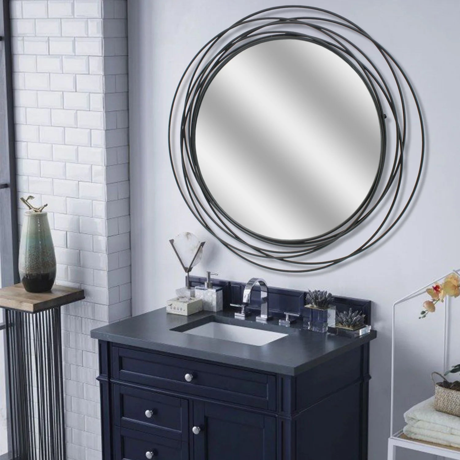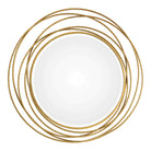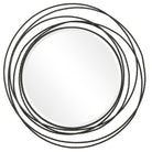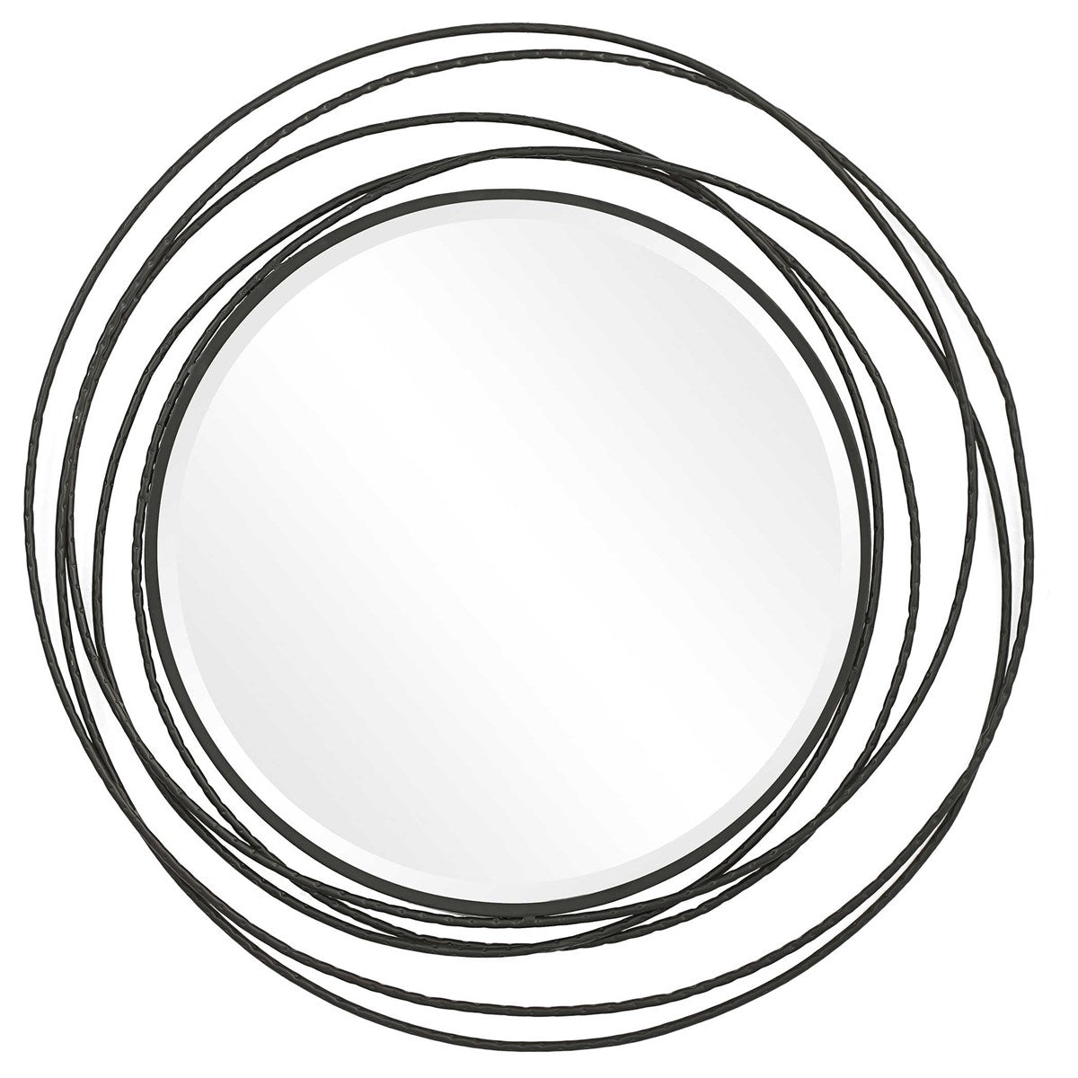 Hand forged iron coils, of the contemporary Whirlwind Round Wall Mirror is finished in metallic gold leaf or black options and accented with a subtle hammered texture. This lively mirror will liven up a wall with a generous 1.25 inch bevel. Ideal in a front hall, foyer or over a console or vanity for a standout reflection of your style.