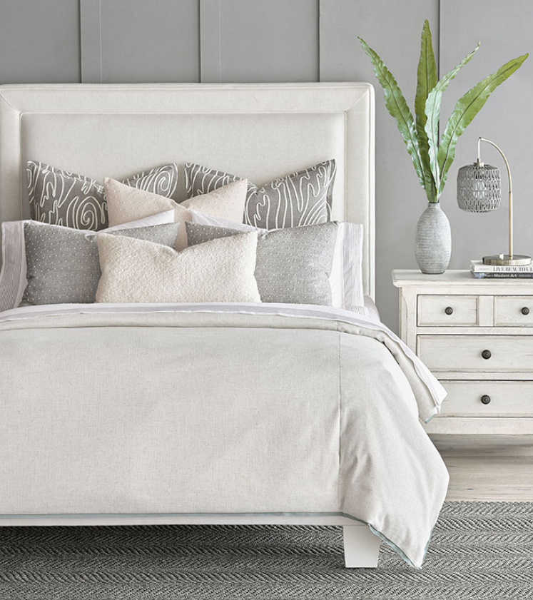Rich in texture and pattern, Thom Filicia's Clearview collection makes a strong statement in warm neutrals. Its striking dotted embroidery and "faux-bois" woodgrain-patterned applique take centerstage against a backdrop of relaxing sands, stones, and creams. Pair with Thom's Albany or Custer Linen coverlets to complete this irresistible aesthetic.