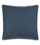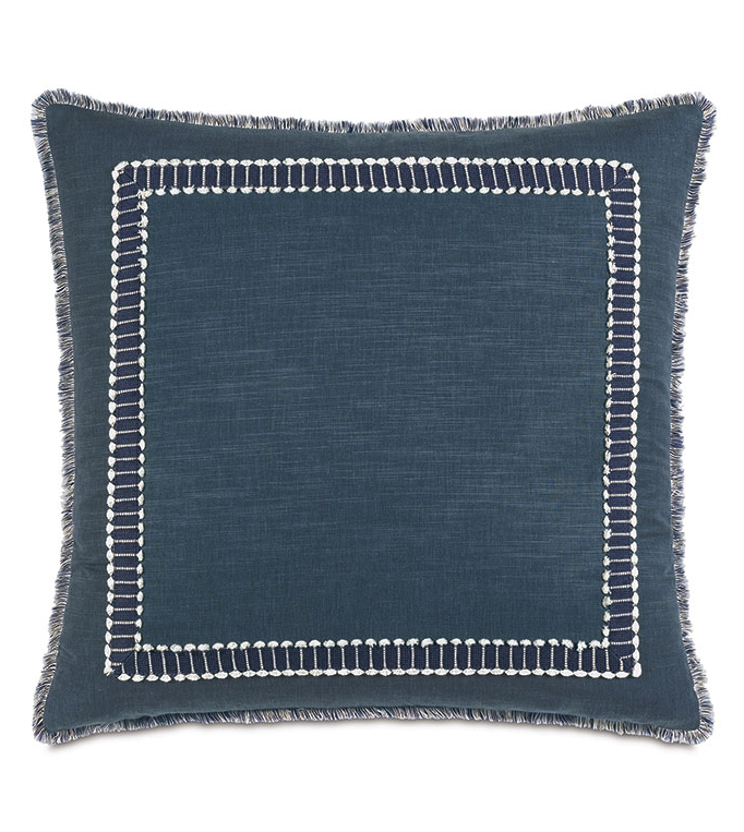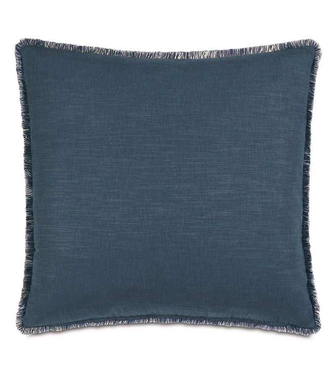 This euro sham in rich blue fabric features tailored mitered corners and a soft brush fringe edge. It’s self-backed for a seamless look and includes your choice of premium inserts. A zipper closure makes cleaning easy.