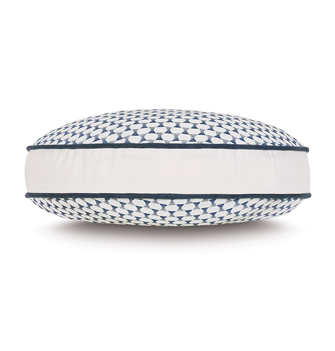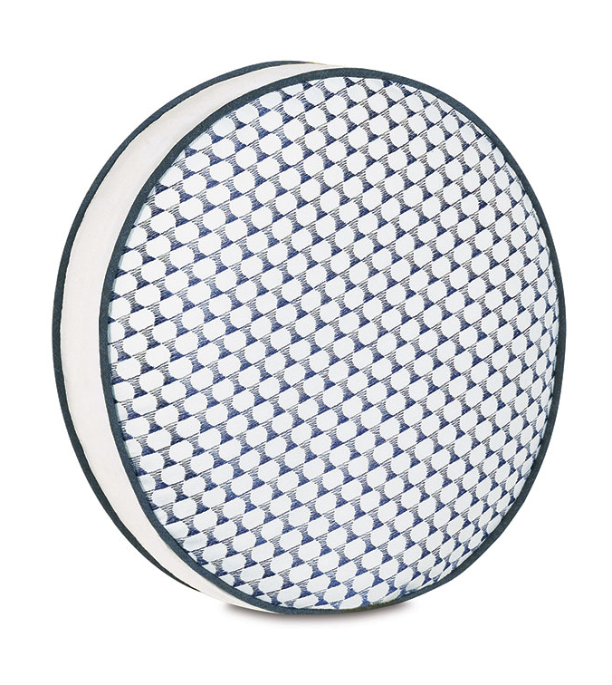 This embroidered tambourine pillow adds a stylish blue and white accent to any room. Made with soft cotton sides and a neat welt edge, it comes with your choice of premium inserts for comfort. A zipper closure makes cleaning easy.