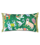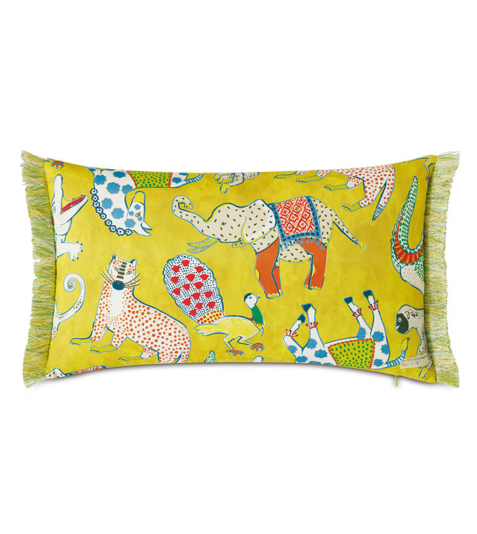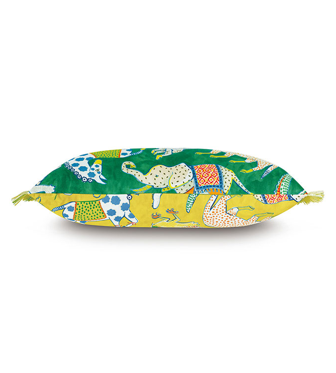This pillow adds fun with a green zoo animal print and reverses to bright yellow for versatile style. Soft brush fringe edges add texture, and a hidden zipper makes cleaning simple. Includes your choice of insert and is machine washable.
