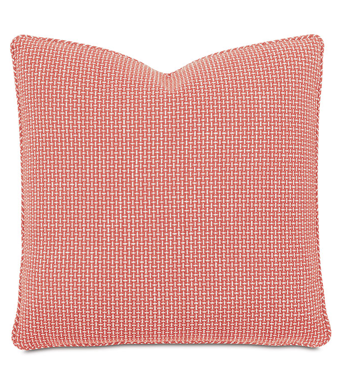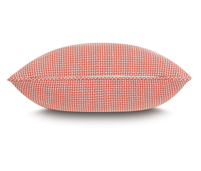 This vibrant pillow features a stylish crosshatch fabric paired with bright coral, backed in Bula Guava with a neat welt edge. Choose from Cloud Faux Down, Plume Feather, or Bliss Blend inserts. It includes a zipper for easy cleaning and offers custom options to suit your home perfectly.