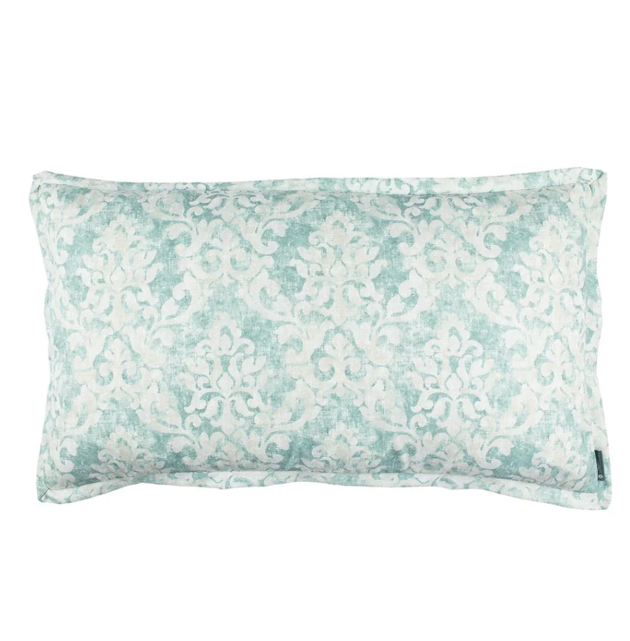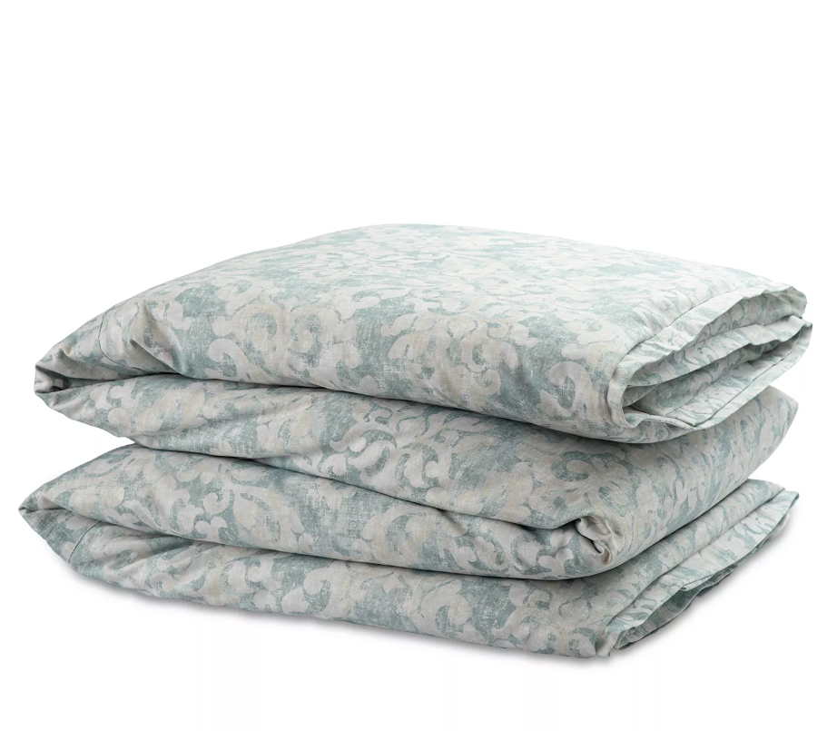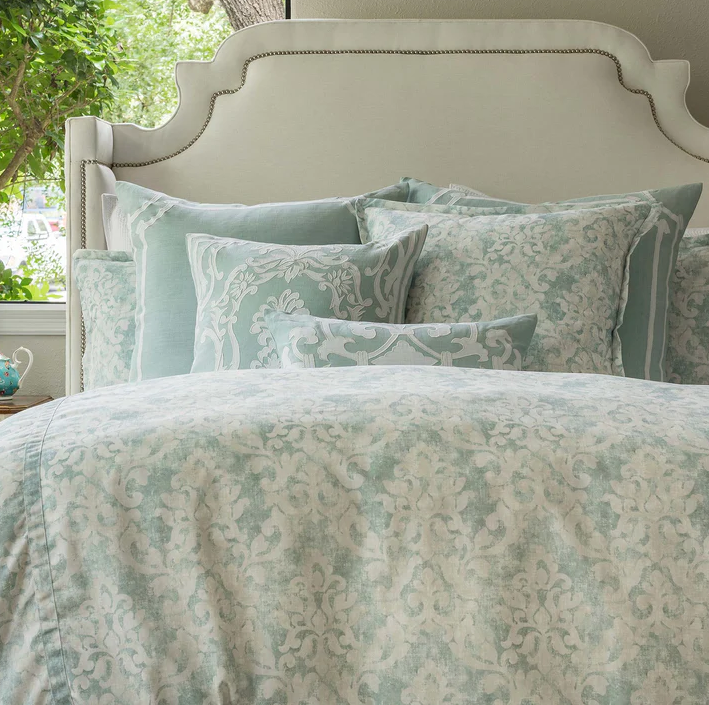 The Milan Duvet & Shams are made with Spa faded damask venetian linen in a classic pattern featured in a subtle seafoam green and white. Sold individually, pillows include insert. Duvet covers do not include insert. We recommend an oversized insert.