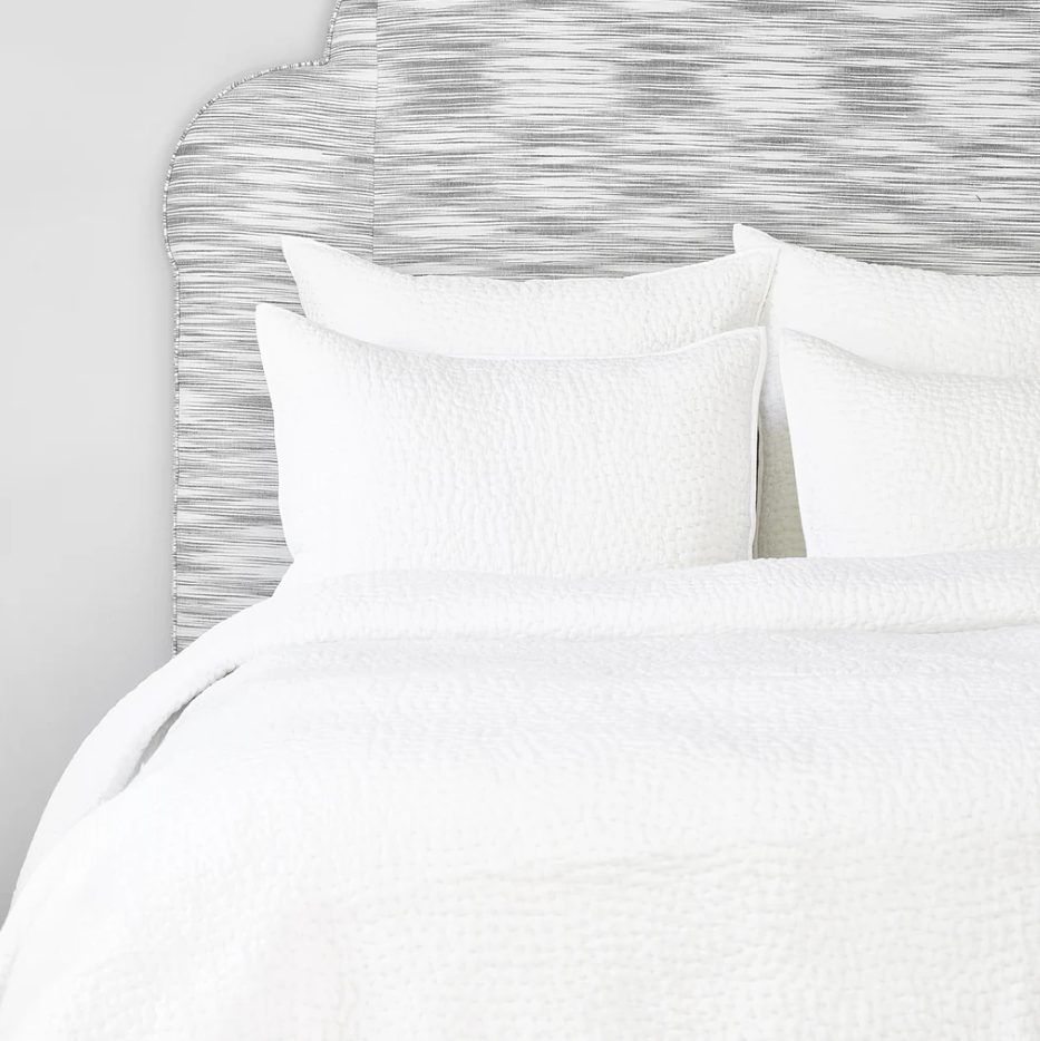 These super fine cotton voile coverlets are patiently & meticulously stitched by hand. Crafted in thin layers of organic white cotton voile and lined with cotton batting, only the super fine fabric brushes against your skin, not the stitches themselves. These shams are so light, yet so warm – ideal for year round sleeping. Available in beautiful range of vibrant threads on contrasting white background; Colors coordinate with other John Robshaw bedding. Sold individually.