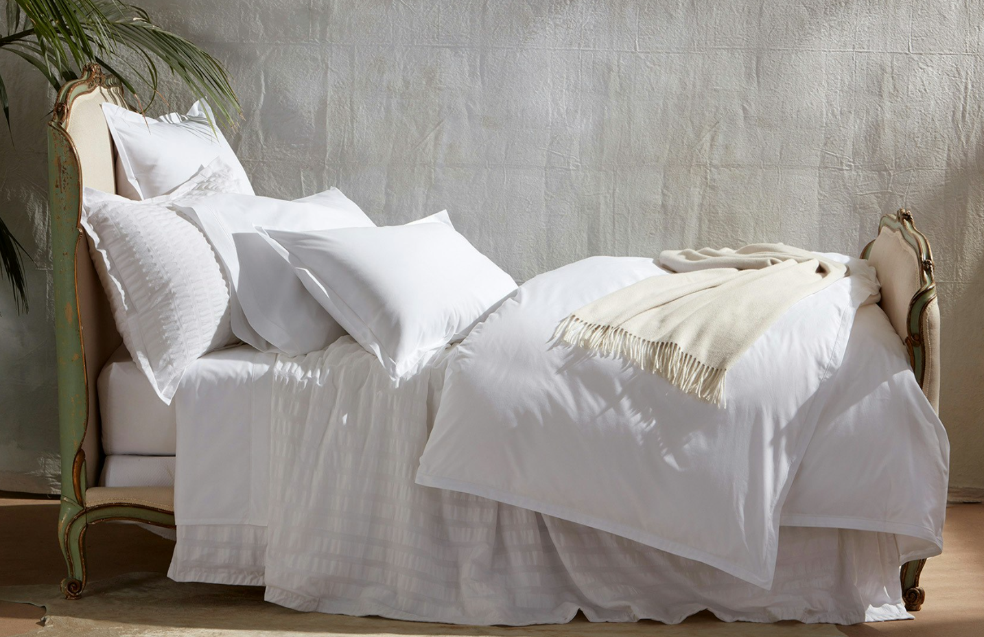 Rows of oversize cotton seersucker and basketweave from Portugal make the style of the Panama Bedding a modern update on a classic look. Pair it with a colorful pattern or layer it on an all-white bed for added texture and subtle pattern. Shams all have flanged edges. Duvet Covers reverses to white Sierra percale & include inside corner ties & hidden zipper closure.