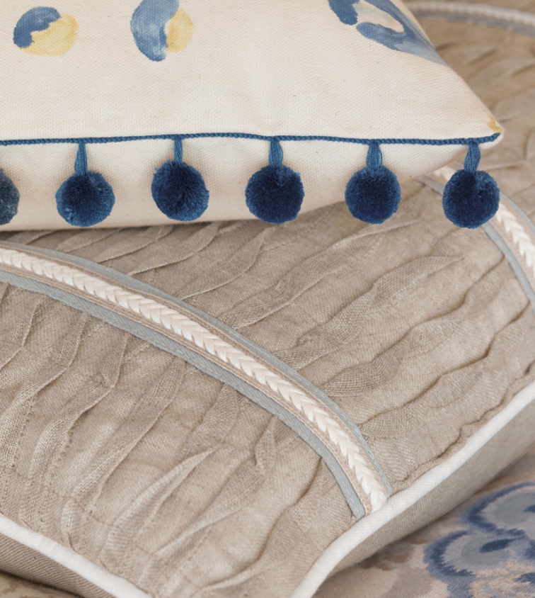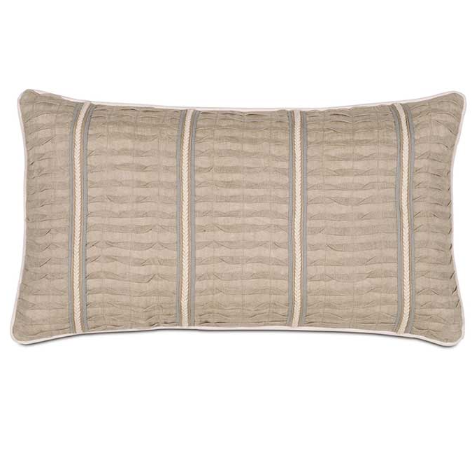 This pillow features a textured linen pintuck front with a stylish trim and reverses to a clean Greer Linen back. Finished with a neat welt edge, it includes your choice of insert and a zipper for easy cleaning. Made in the USA, it adds elegant detail to any space.