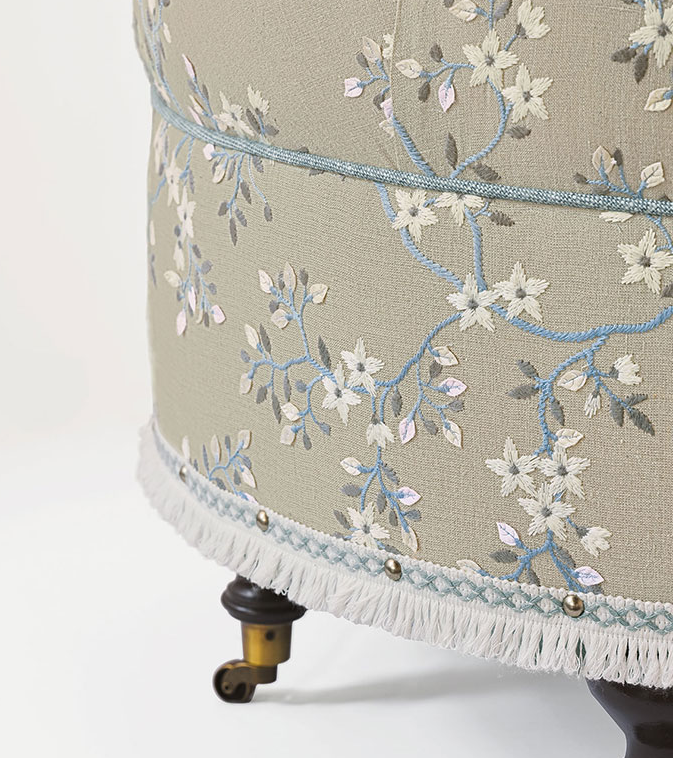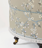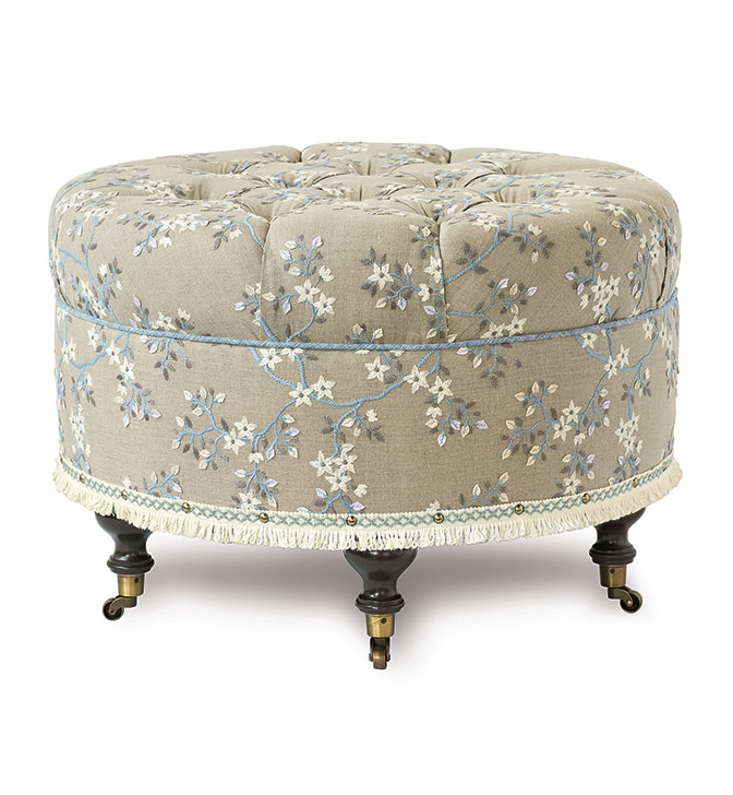 The Amberlynn Embroidered Ottoman offers plush comfort with its high-density foam cushion covered in elegant floral cotton fabric. Hand-tufted buttons and a classic cord edge add refined detail. Supported by sturdy espresso wood legs with smooth brass casters, it combines style and mobility. Perfect for adding charm and function to your space.