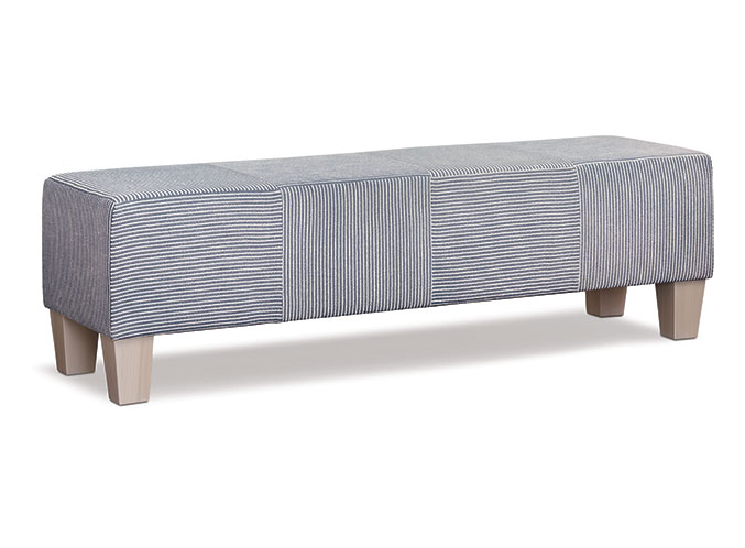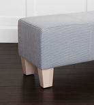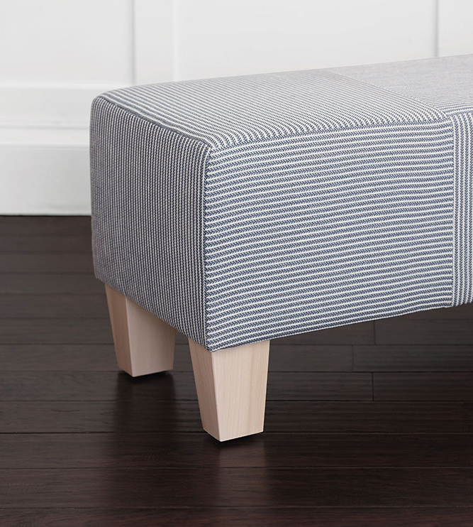 Make a bold yet tailored statement with these upholstered bedroom benches, featuring alternating horizontal and vertical stripes in the richly woven Osiris Lake fabric. Expertly made in Chicago, the Standard and Grande benches showcases a clean knife edge finish and thick, tight upholstery over high-density foam for lasting comfort and durability. Hand-stained wood legs in a Natural finish and felt-padded glides complete the piece with thoughtful detail. Made to Order- 4-6 weeks