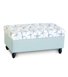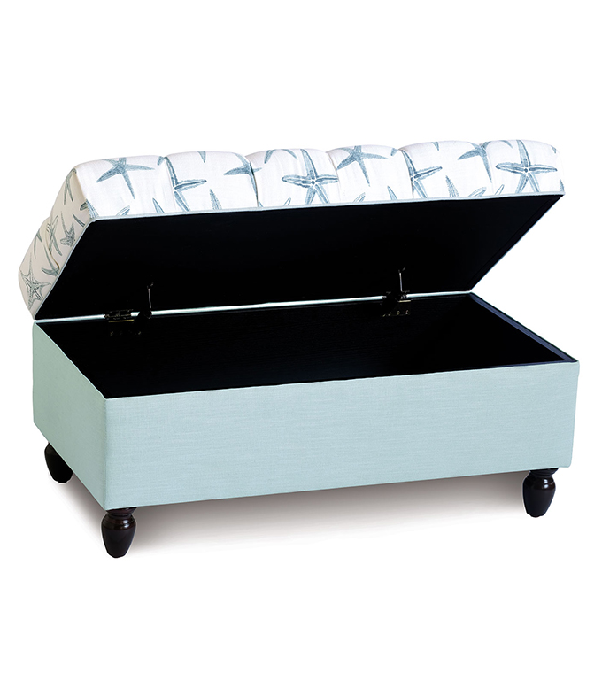 This light blue storage chest combines style and function with a starfish-printed cushioned top for comfort and coastal charm. Handmade in Chicago, it features a spacious solid wood interior for organized storage, safety hinges, and floor-friendly glides. Durable and elegant, it’s a perfect addition to any room.