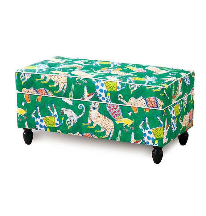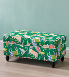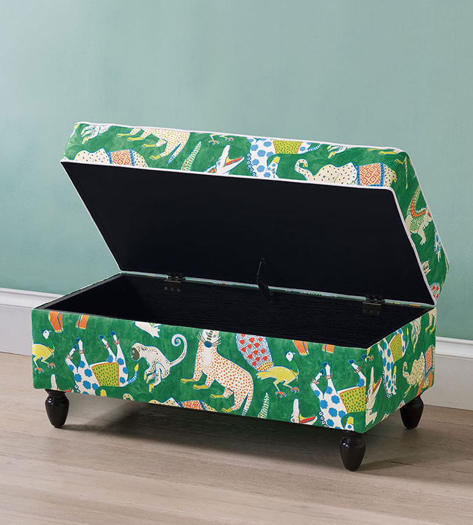 This charming upholstered bench combines comfort and storage with a playful green zoo pattern cushion. It features a soft, hand-tufted top and a lined interior compartment with safety hinges for secure storage. Supported by sturdy solid wood legs, it’s both stylish and practical—perfect for adding a unique touch to your space.