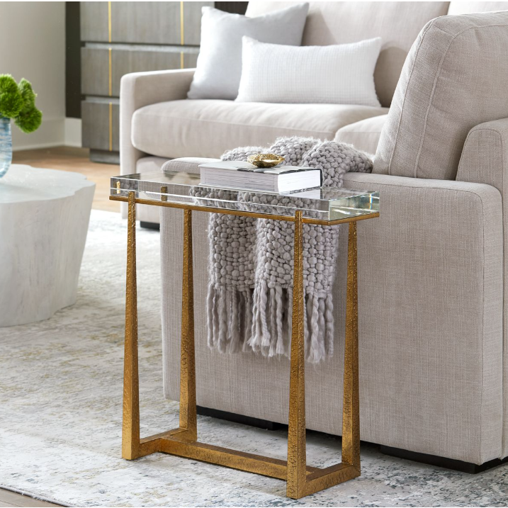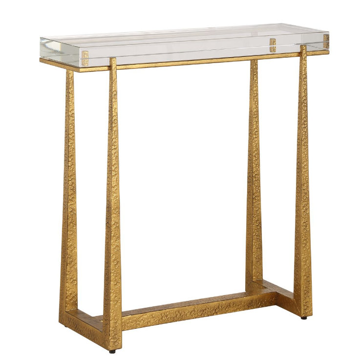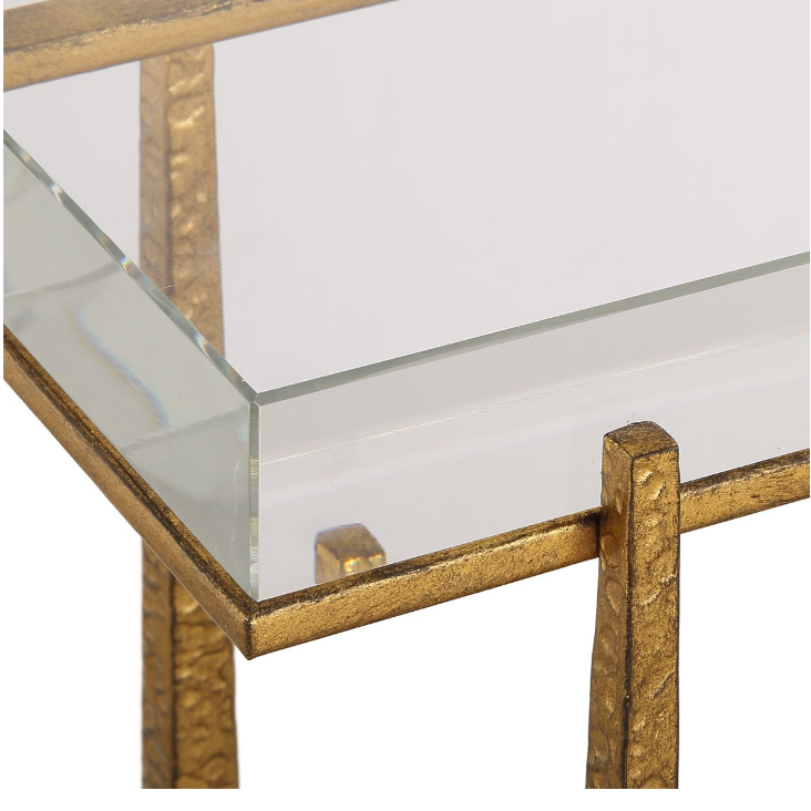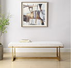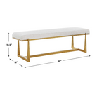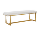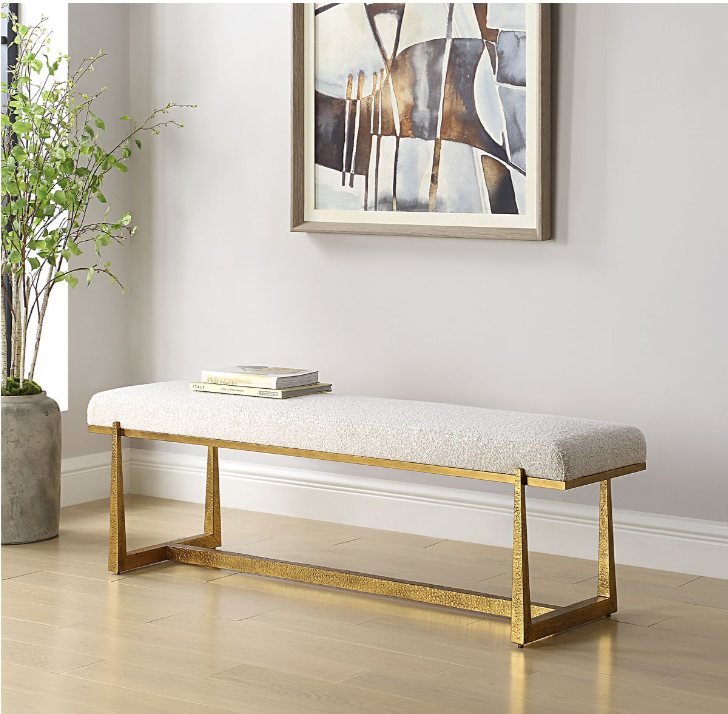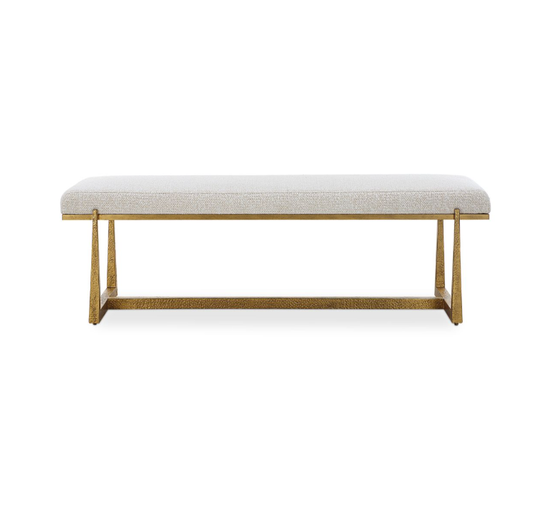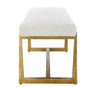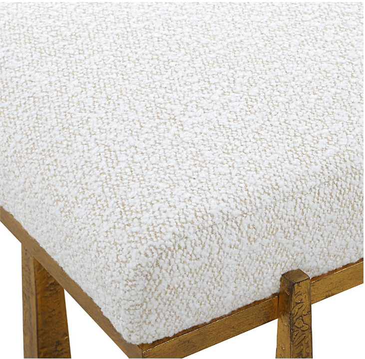 This elegant bench adds a touch of luxury to any room. The textured antique gold finish iron legs perfectly support and accentuate the creamy driftwood tone of the upholstered top in a polyester blend with boucle wool-like texture.