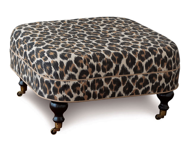 This stylish ottoman offers comfortable, durable seating with thick padding and high-density foam support. Upholstered in a chic leopard spot fabric with a neat welt edge, it features solid wood legs and smooth brass casters for easy movement. Perfect for adding bold elegance to any room.