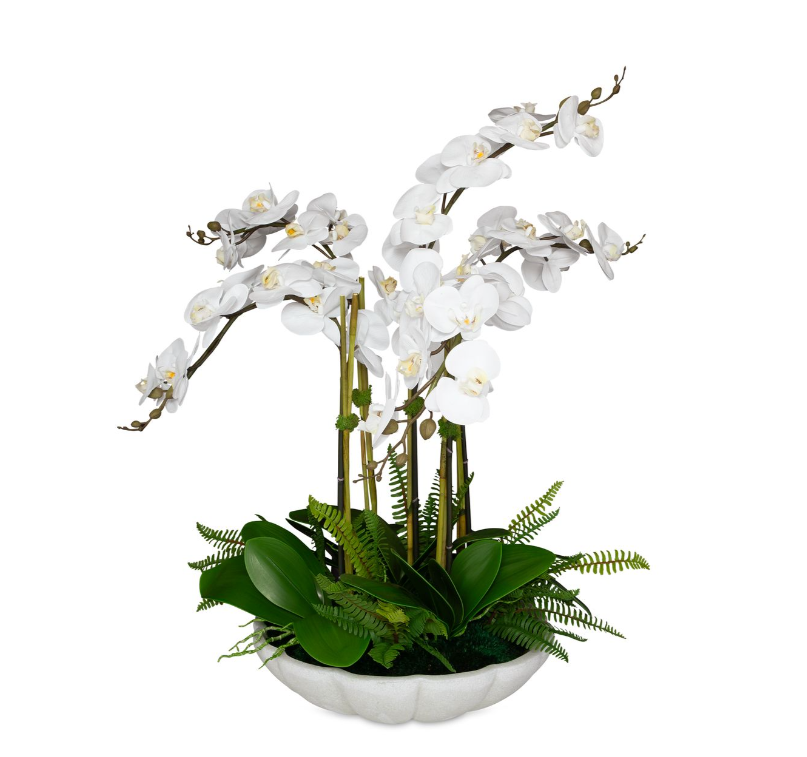 Each leaf, bloom and stem of these realistic faux White Orchids is an absolute showstopper with gracefully arching stems of crisp white, real-touch orchids. Adding lush appeal is the bed of naturally preserved moss with boston fern accents, displayed in an elegant bowl crafted from ivory man-made stone that accurately replicates the look of Thassos marble. These nearly-natural flowers need no watering or light providing years of enjoyment.