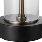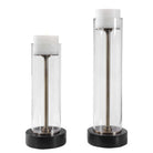 This set of two contemporary (2) Charvi Candleholders feature an aged brass stand surrounded by a clear glass hurricane cylanders and finished with a thick bronze foot. 2 distressed off-white candles included.