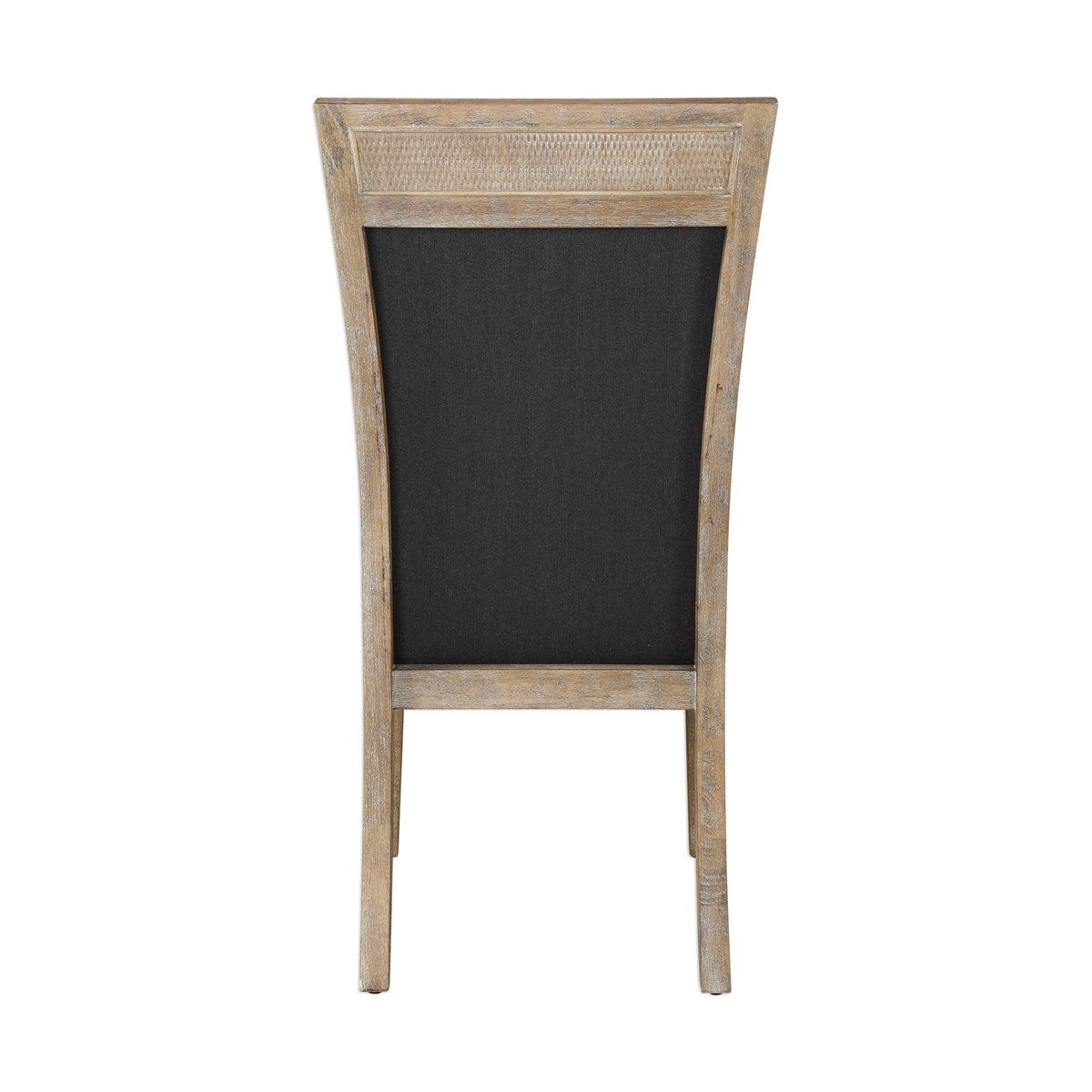 Make a dramatic style statement with this supportive high back chair, featuring a cane accented top in a hand rubbed sandstone exposed hardwood finish, tailored in a durable yet lush dark gray fabric with a subtile herringboe pattern. Makes a perfect statement with the other pieces in the Encore Collection