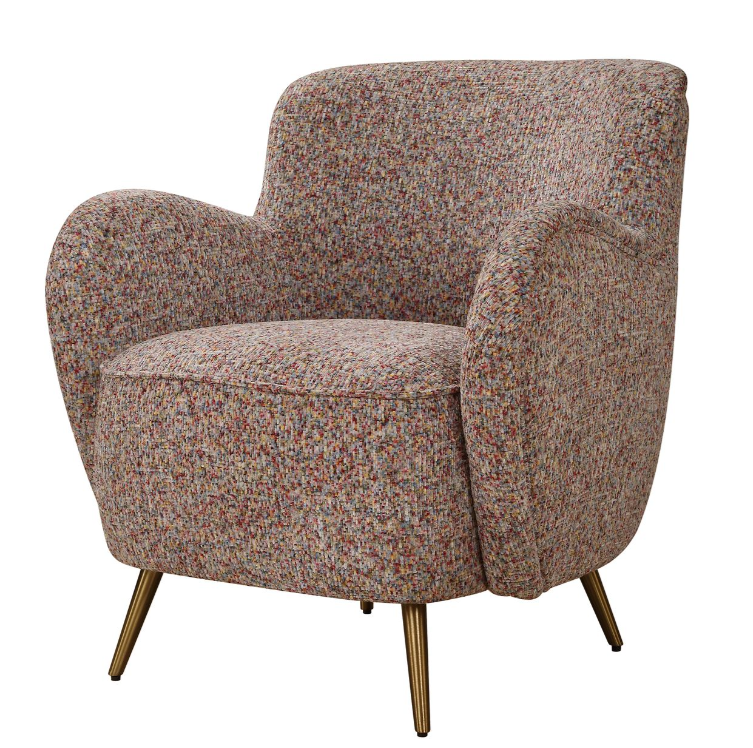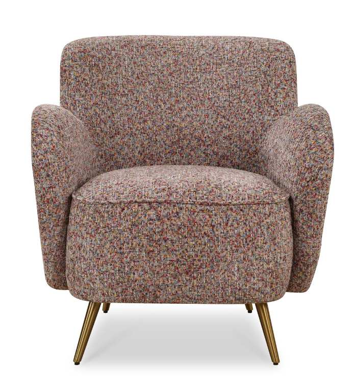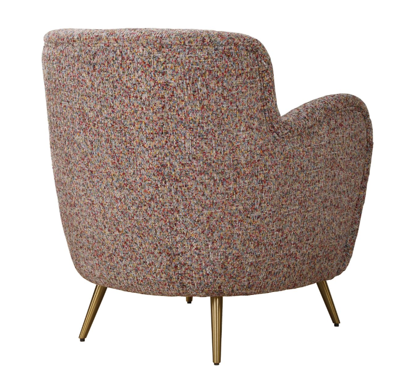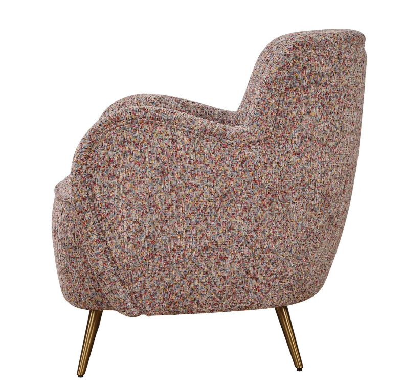 Destined to be the jewel of any room, with retro curves in a stunning textured chenille in confetti tones. Paired with brushed brass stainless steel tapered legs.