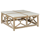 Handcrafted from solid mixed woods with an natural ivory limestone top, set on a geometric base and finished in a warm oatmeal wash; The California Coastal inspired design of the Catali Coffee Table includes characteristics of natural stone, and wood that will continue to evolve with temperature and humidity changes, adding to its authenticity and character. Each piece will have unique coloration and veining and grain.