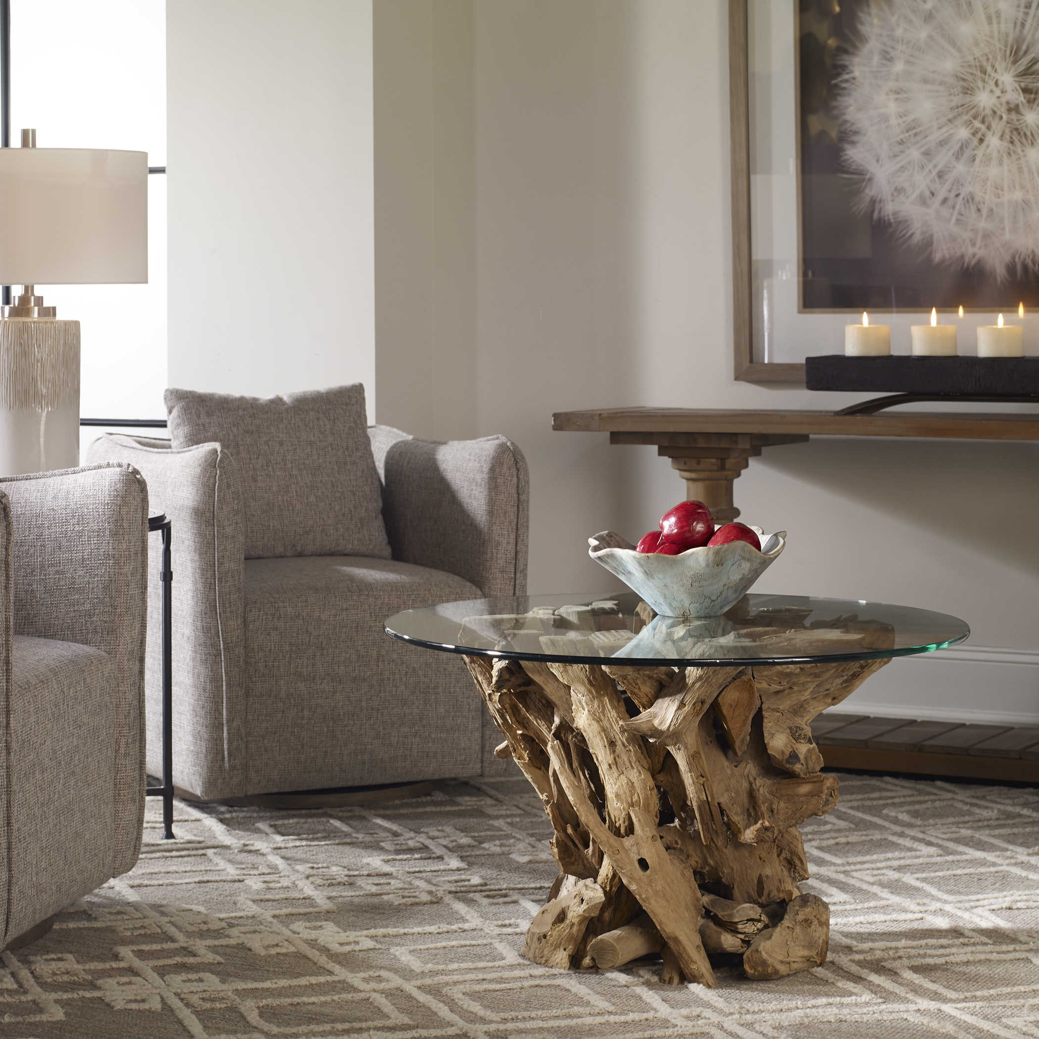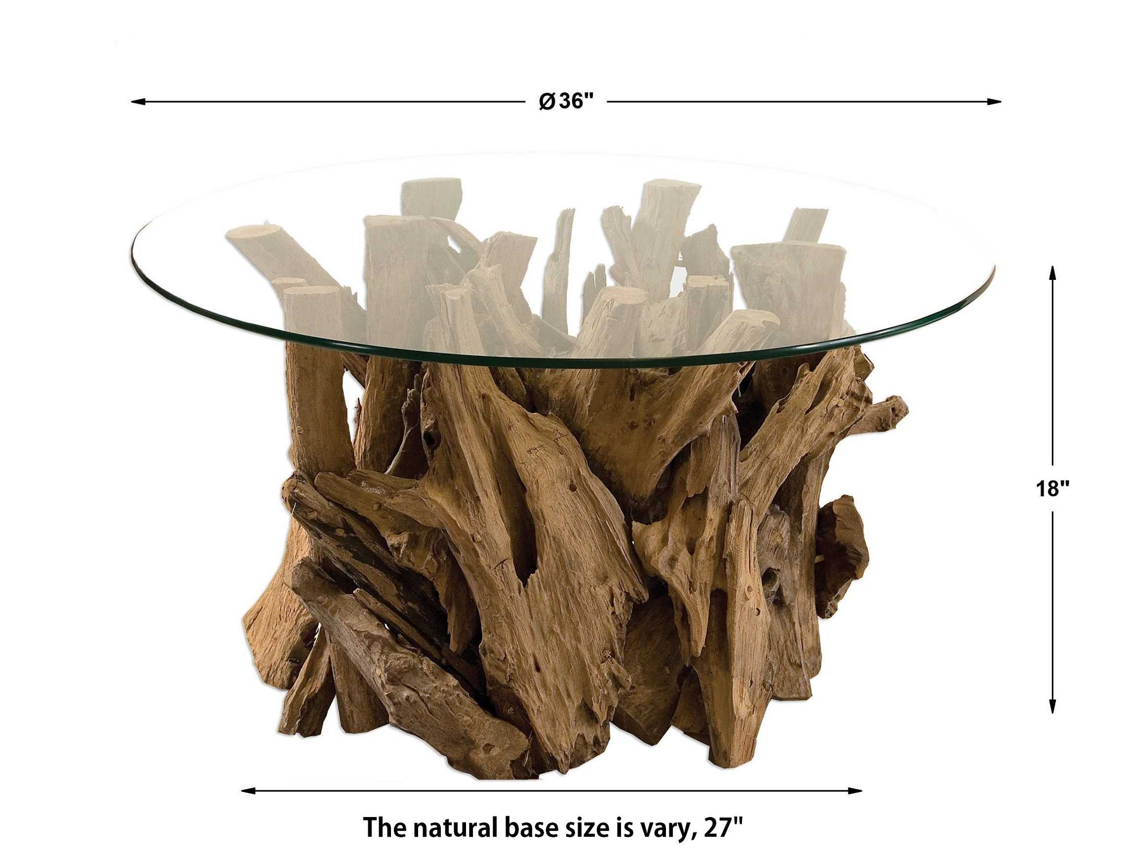 The Driftwood Small Coffee Table is crafted from pieced Teak wood in its natural finish, paired with a clear glass top. This coffee table screams organic beauty and function, serving as a decorative art piece while the glass-top makes it highly functional. Each base is unique and will vary slightly in size, detail, grain and color due to the nature or organic material. Cracks and variations in grain are normal.