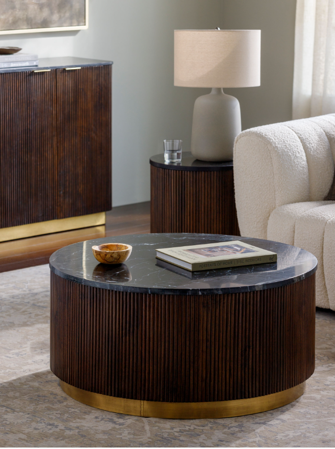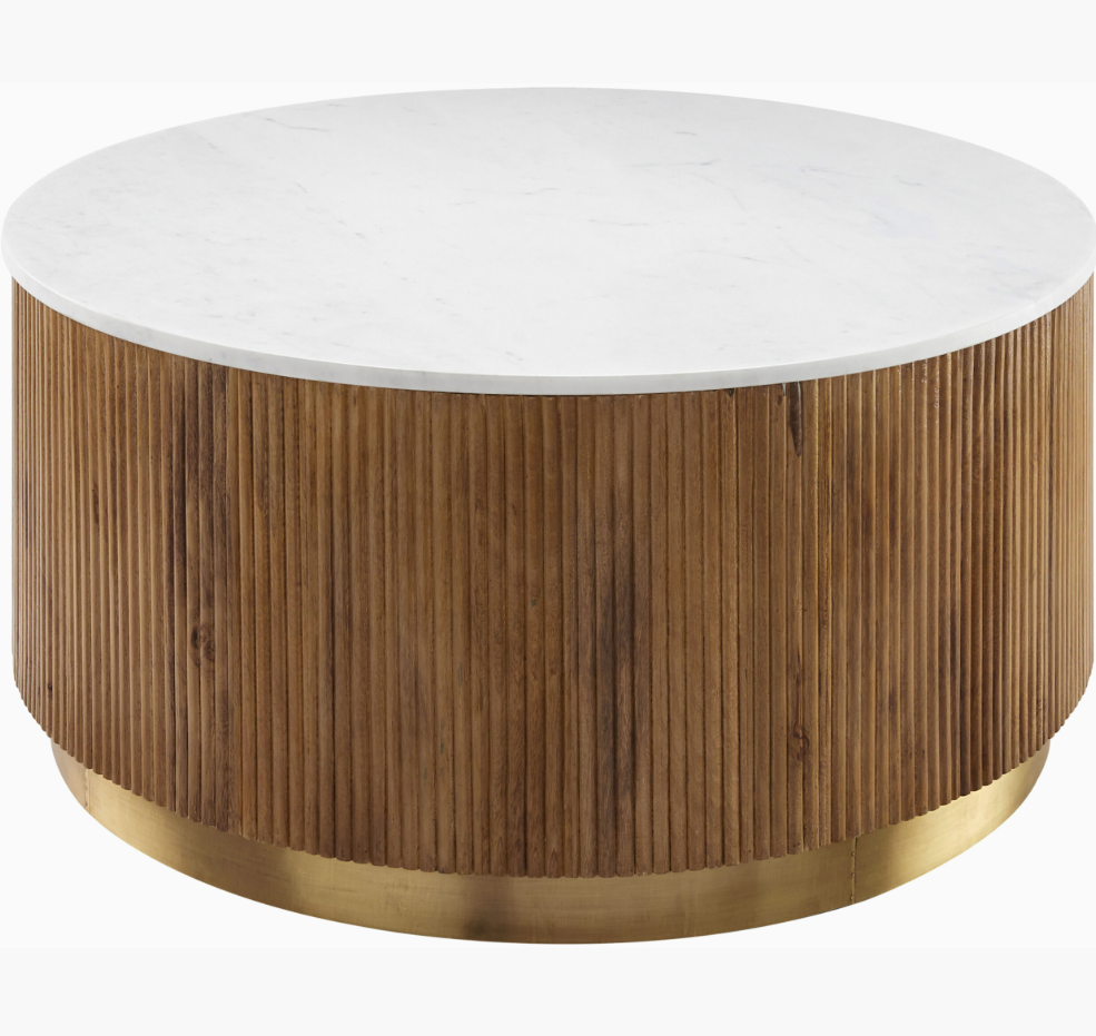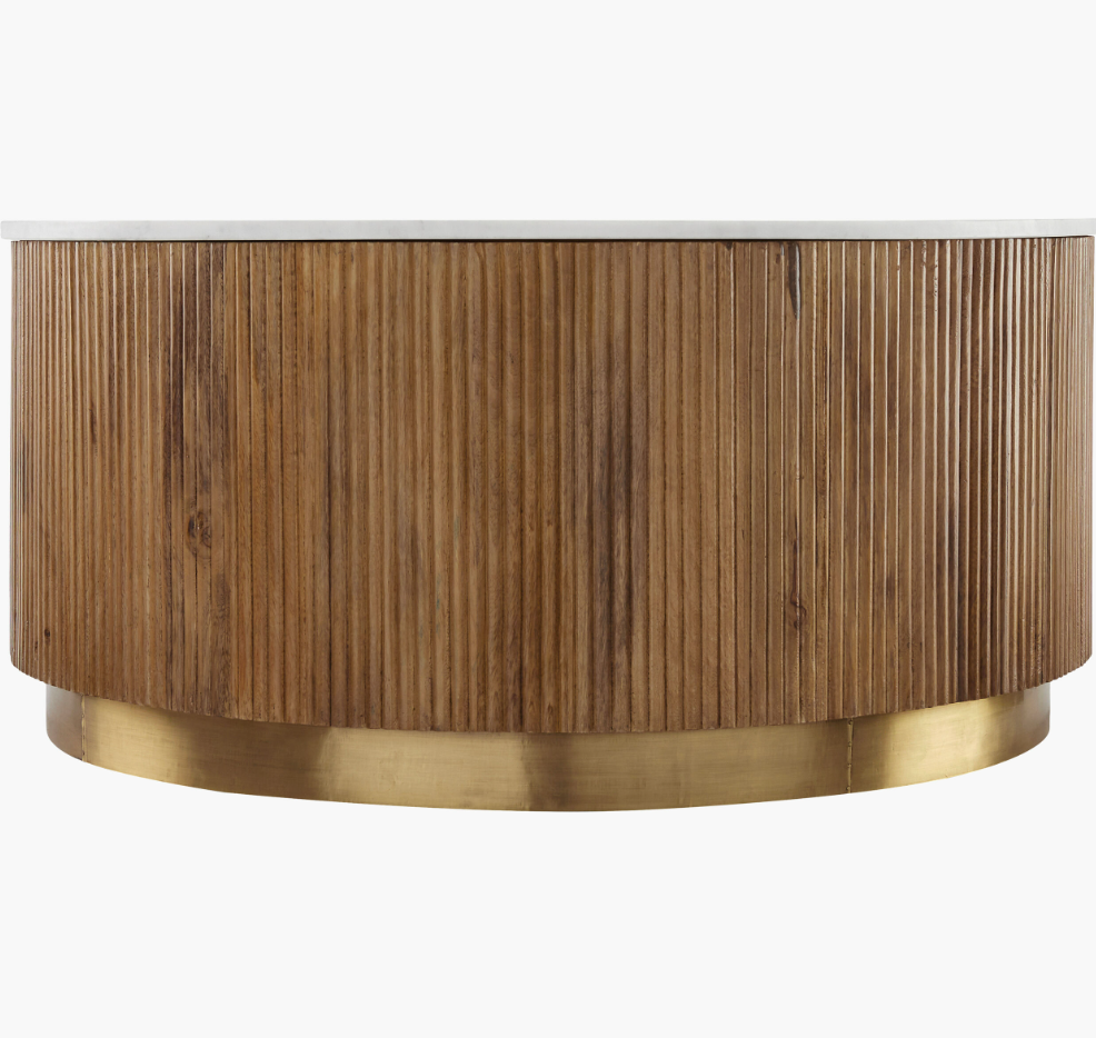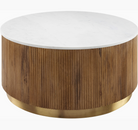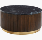 Introducing the Nems Coffee Table - a unique blend of drum shape, fluted mango-wood, and a stunning marble top. Choose from a light natural finish with white marble or a dark brown stained mango wood with black marble. Both options feature an inset brushed brass base for a touch of elegance.