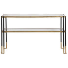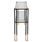 Featuring a clean lined solid iron frame, this contemporary console is finished in a two-toned matte black and brushed gold. Has two tempered glass shelves.