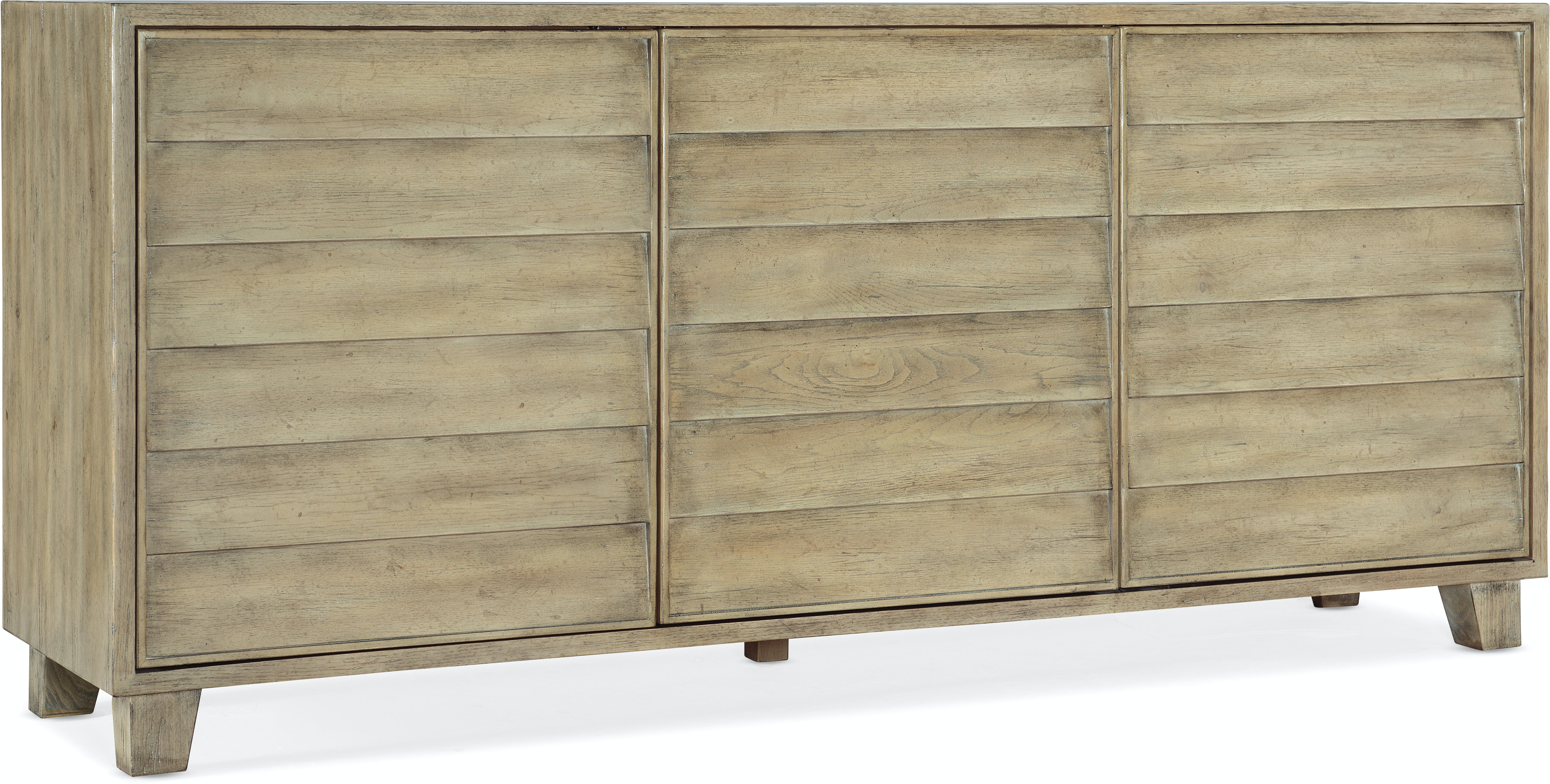 The Surfrider Buffet features 3-doors with touch latches and soft-close hinges concealing two (2) self-closing drawers. Crafted of Quartered Pine and Maple Veneers with a Solid-Wood edge top, it's finished in a light natural finish, creating a relaxed, yet sophisticated style,epitomizes a coastal style. Behind the left doors is 1 adjustable shelf and 2 behind the right door.