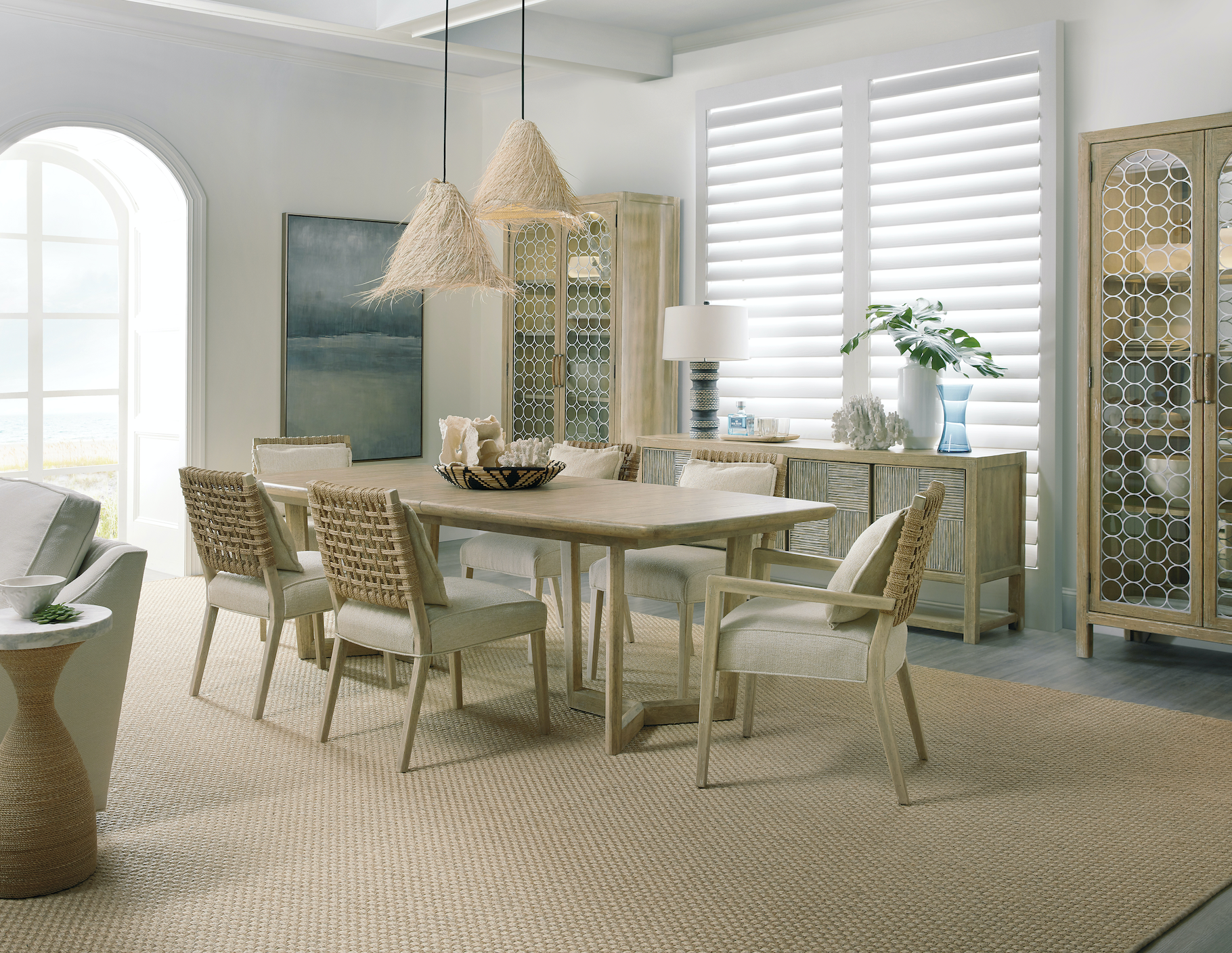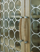 The Surfrider Display Cabinet transforms your home into a coastal retreat with its designer metal fretwork over glass doors and antique mirror back. Features four adjustable glass shelves with 3-intensity lighting. Crafted from Pecan Veneers in light Driftwood finish with natural distressing, this piece combines luxury and relaxed beach-town sophistication for a calming escape from everyday life.