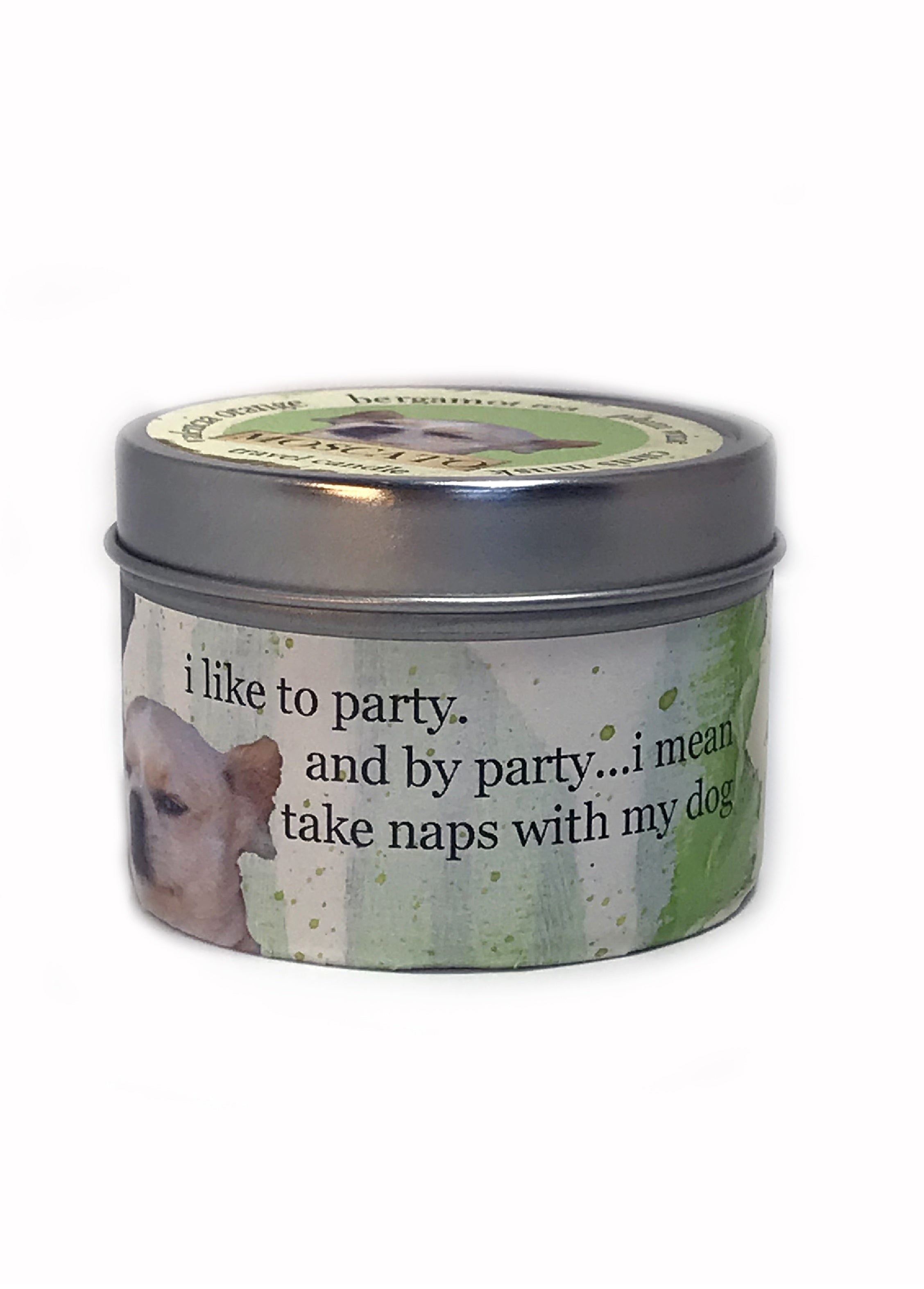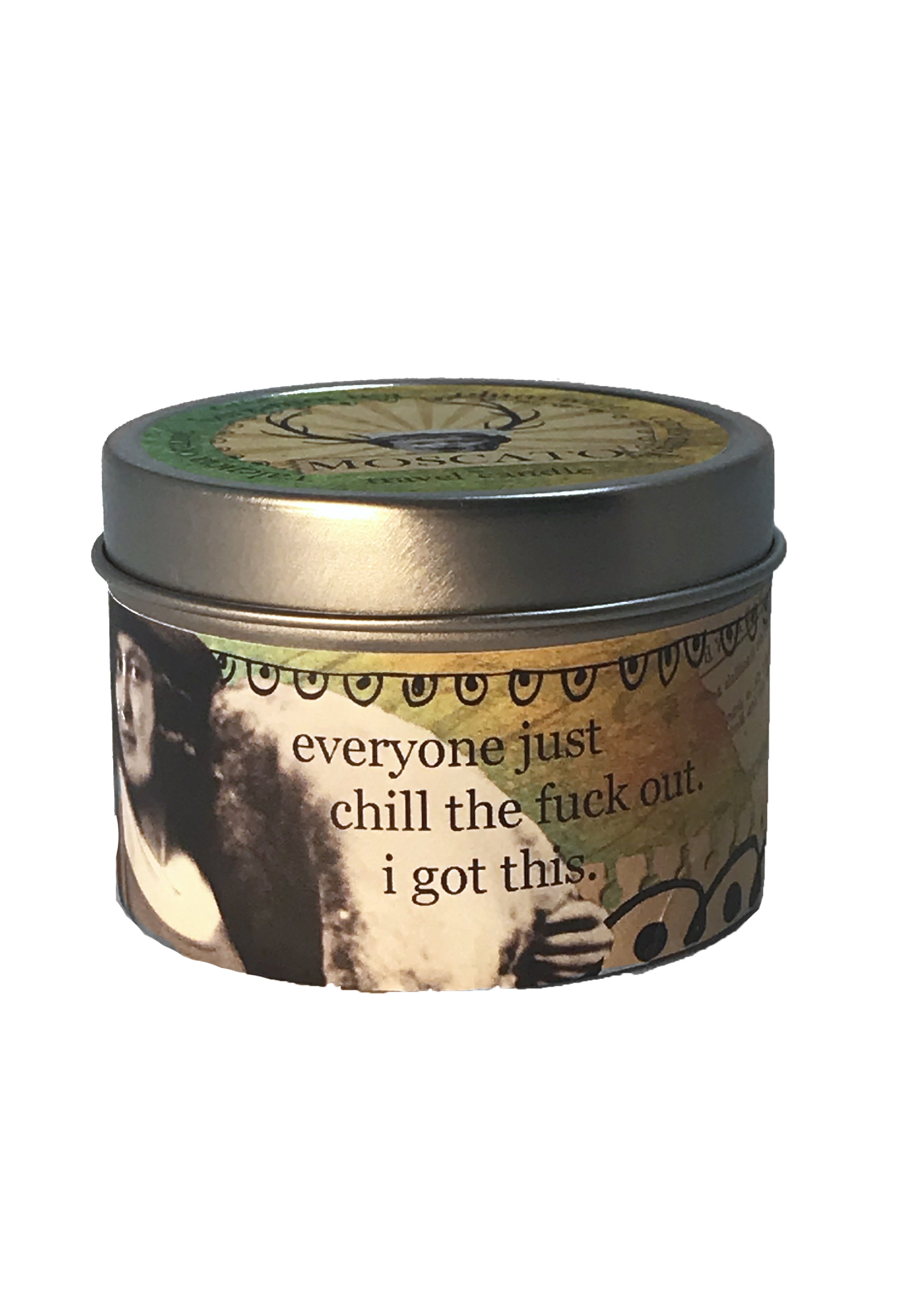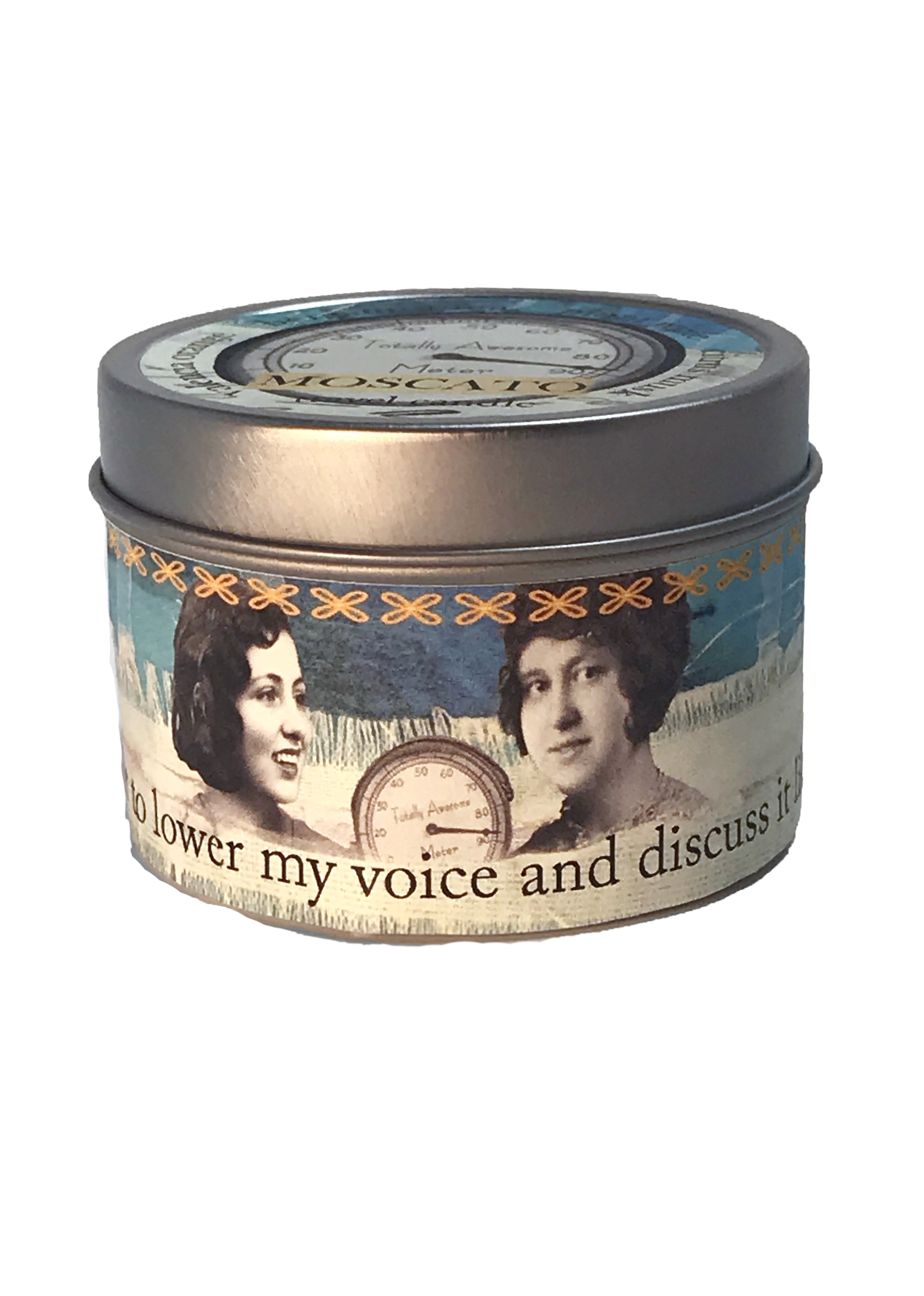 This lightweight travel candles are hand poured with 4 oz. of pure soy wax into a tin jar with lid. This candle will provide approx. 20 hours burn time and is a perfect addition to your travel bag. Essential oils of Valencia orange, bergamot tea, plum wine and citrus musk make an enticing Moscato fragrance candle. Available in 4 different checky wrappers with fun sayings. Makes a perfect gift for a friend or irreverent travel partner. By artist Erin Smith