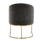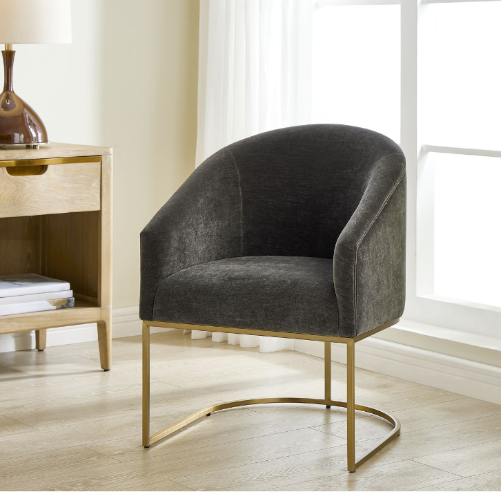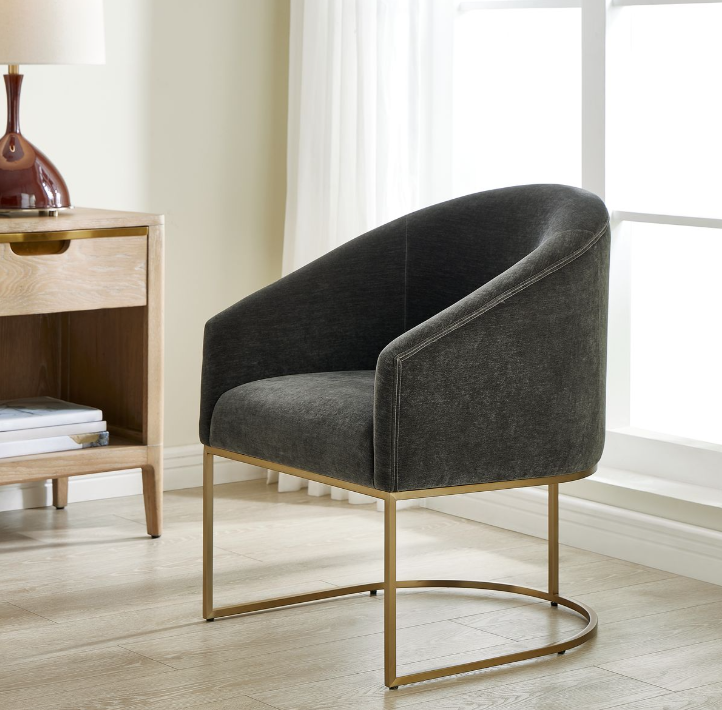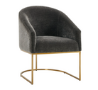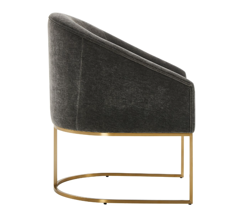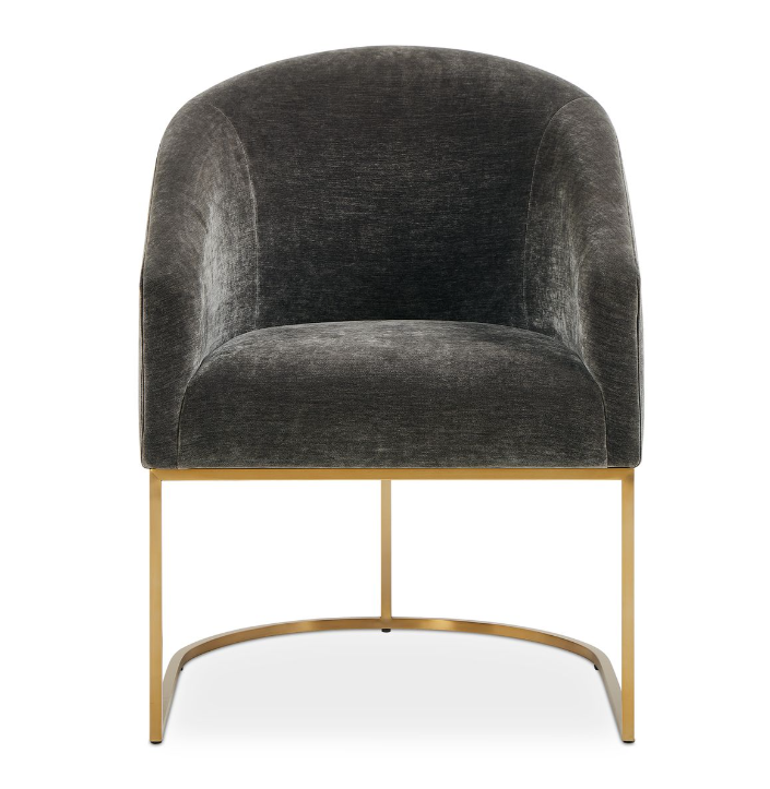 The Hanni Dining Chair features a sleek, curved steel frame in a brass plated finish and a barrel style seat upholstered in charcoal polyester velvet. This chair is the great equalizer! Neither a head chair or a side chair, it sits comfortably in velvet with a rounded barrel type back and sloped arms. Make everyone feel like a king or queen.