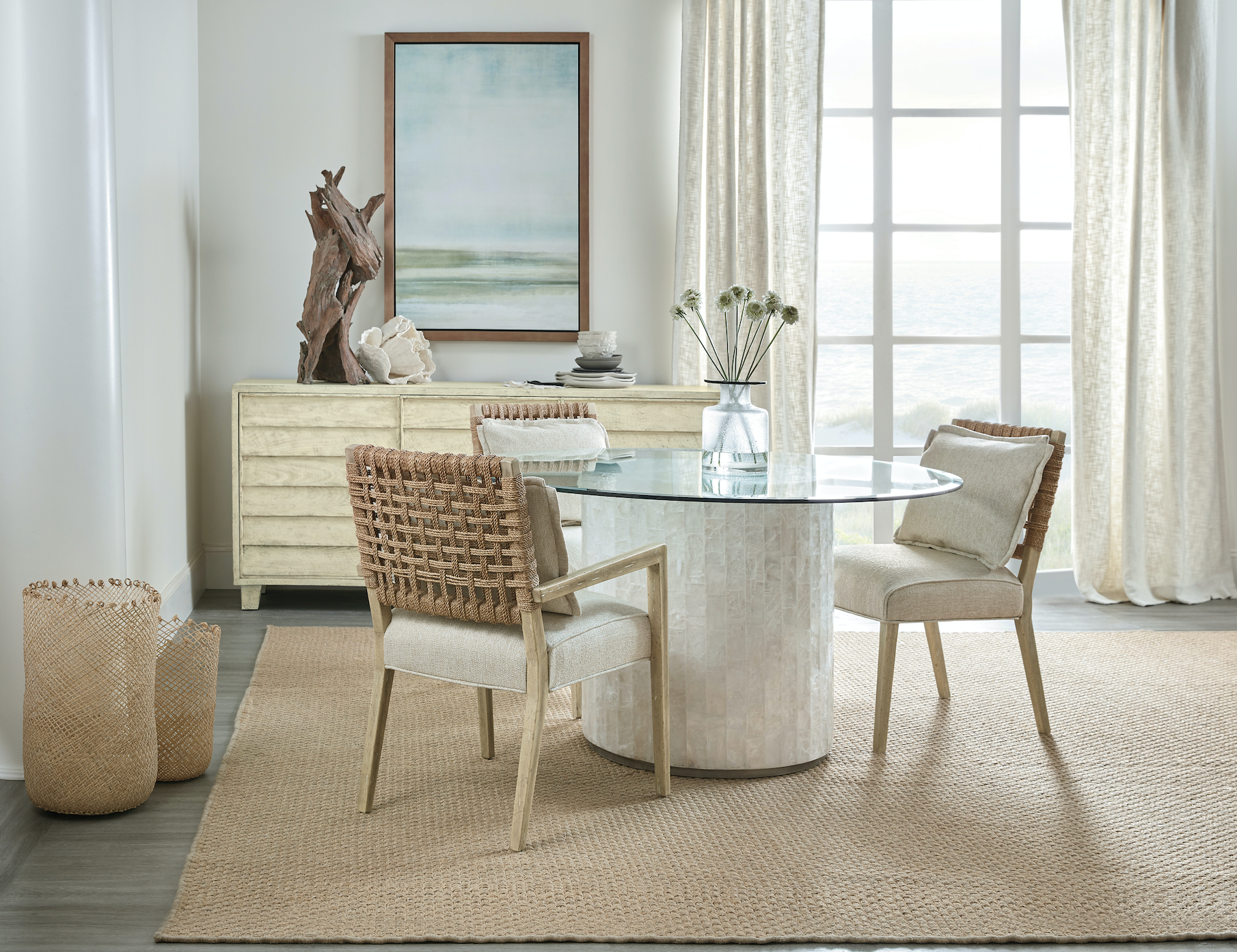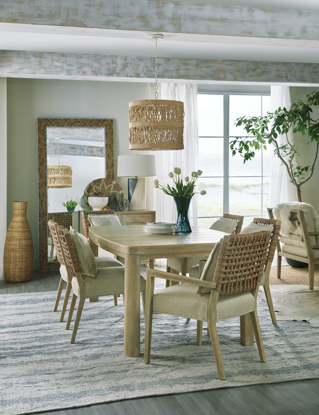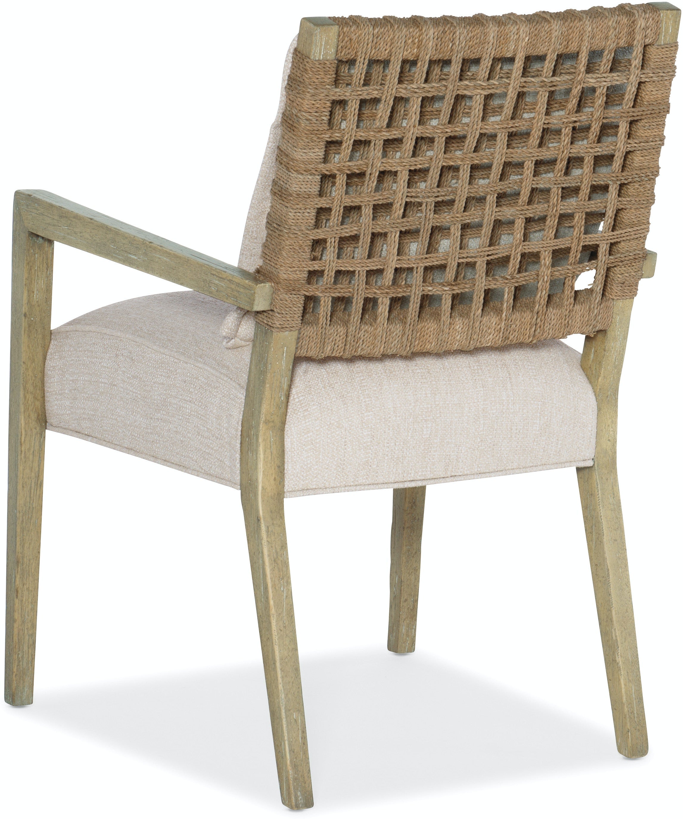 Casual California-inspired arm chairs with woven rope backs and natural Driftwood finish. Features upholstered seats and loose pillow backs in cream performance fabric for easy maintenance and comfort. Perfect for creating a relaxed, sophisticated coastal retreat in your home.