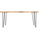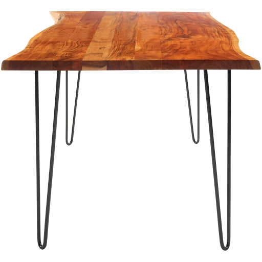 Ther Bergen Modern Wood Dining Table features a "live edge" wood top finished in a natural tone that reveals the character of the boards. The table also features industrial bent metal legs.