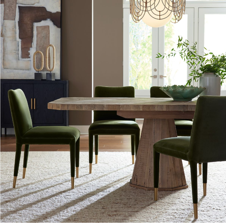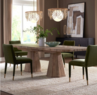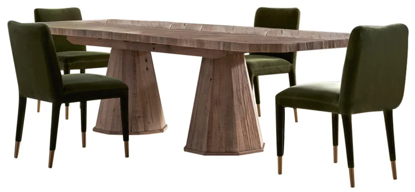 Made from solid reclaimed oak, this table features a beautifully crafted herringbone inlay on the tabletop, complemented by two striking geometric pedestal bases. The design seamlessly blends rustic charm with contemporary elegance. Solid wood will continue to move with temperature and humidity changes, which can result in cracks and uneven surfaces, adding to its authenticity and character. With two 12" leaves, this fixed base extension dining table features an adjustable dining surface that can vary from 90", 102", or 114".
