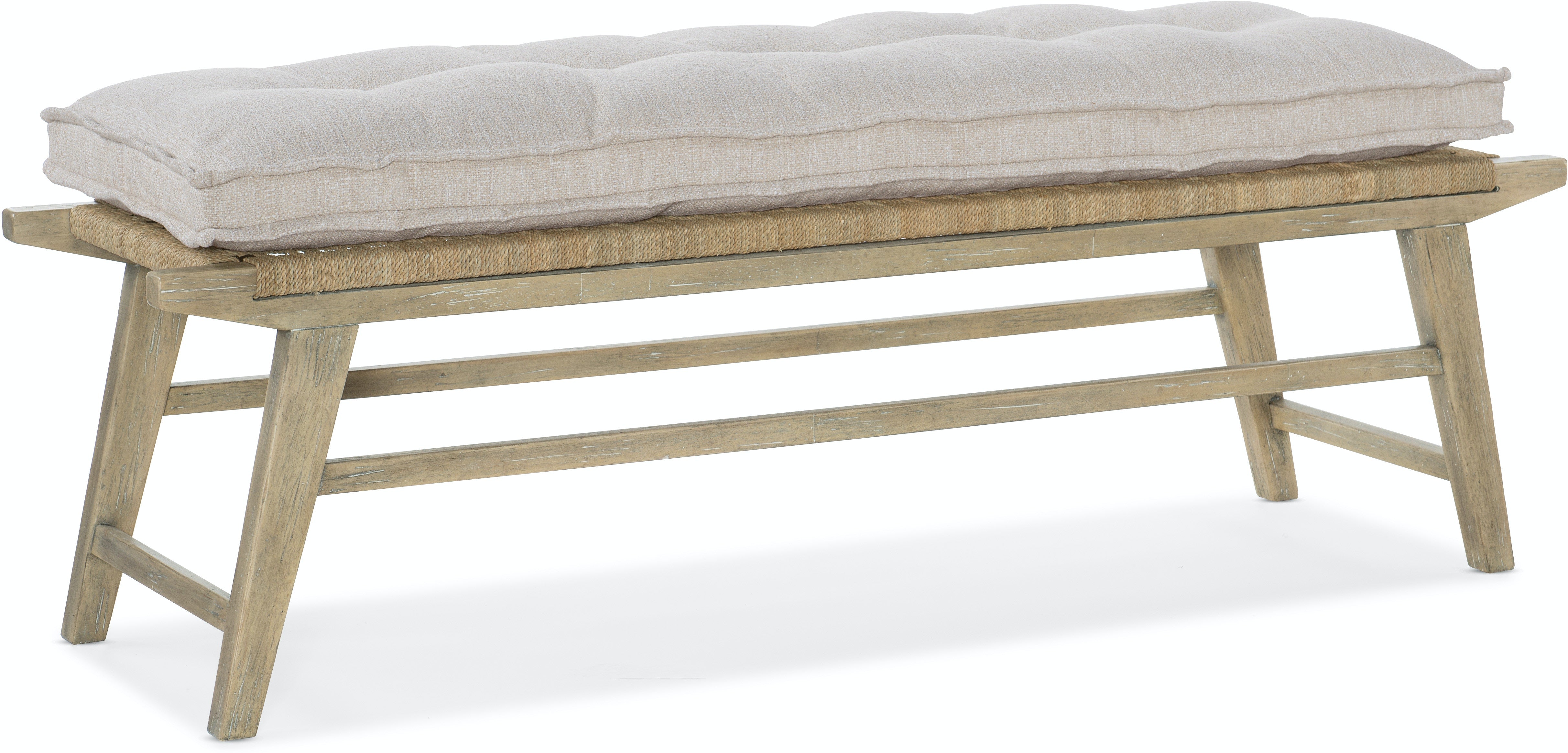 The Surfrider Bed Bench combines natural wood with a woven rope seat and comfortable Zuri Cream cushion for easy maintenance. Its distressed Driftwood finish creates a light, airy coastal aesthetic. Perfect for adding sophisticated beach-town charm to any space while providing practical seating.