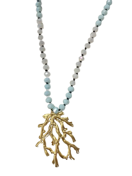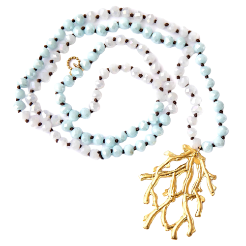 Faceted Two-Tone Aqua and White Quarts gemstones paired with a polished brass coral pendant. Quartz-Lessens Fear & promotes Relating to Others