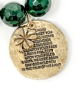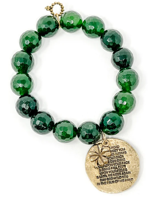 PowerBeads By Jen Charm Bracelet -Faceted Green Clover Agate with Irish Prayer & 4-Leaf Clover. Every Power Beads by Jen is handmade with love in the USA.