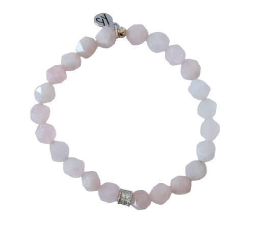 T.Jazelle Rose Quartz Stacker Charm Bracelet- Rose Quartz is known as the stone of unconditional love and healing. Worn to help bring calmness to the body. This Stacker bracelet works well stacked with other T.Jazelle Bracelets. 8mm Rose Quartz Stones & Sterling Silver bead