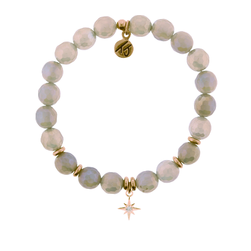 T.Jazelle- Mystic Grey Agate "It's Your Year" Charm Bracelet is worn to bring supportive energy to the wearer known for its healing and soothing qualities. 8mm faceted stones are separated by two gold rings on each side of the gold star charm in the center This charm is a symbol of new beginnings. When you put on this bracelet know that you got this! Let go of the past, do what makes you happy and let this year be your year! YOU are unstoppable.