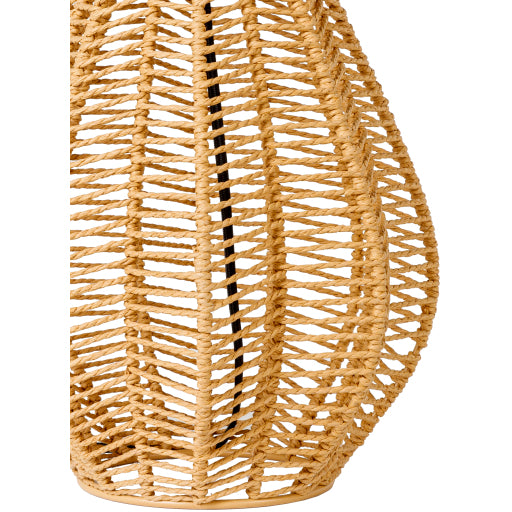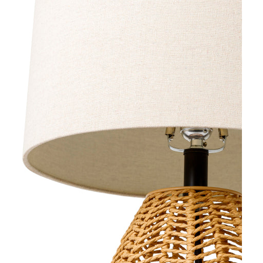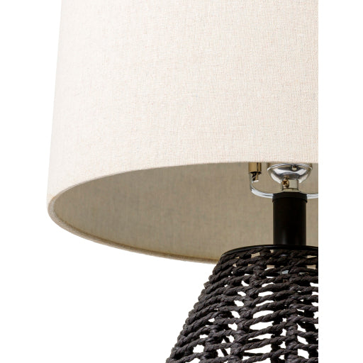 The Abaco Table Lamp is a boho gem! Available with a black or natural colored woven base and topped by an Ivory Linen drum shade and black stem and finial; this california casual woven table lamp is actually made from treated paper.