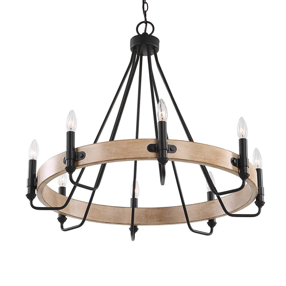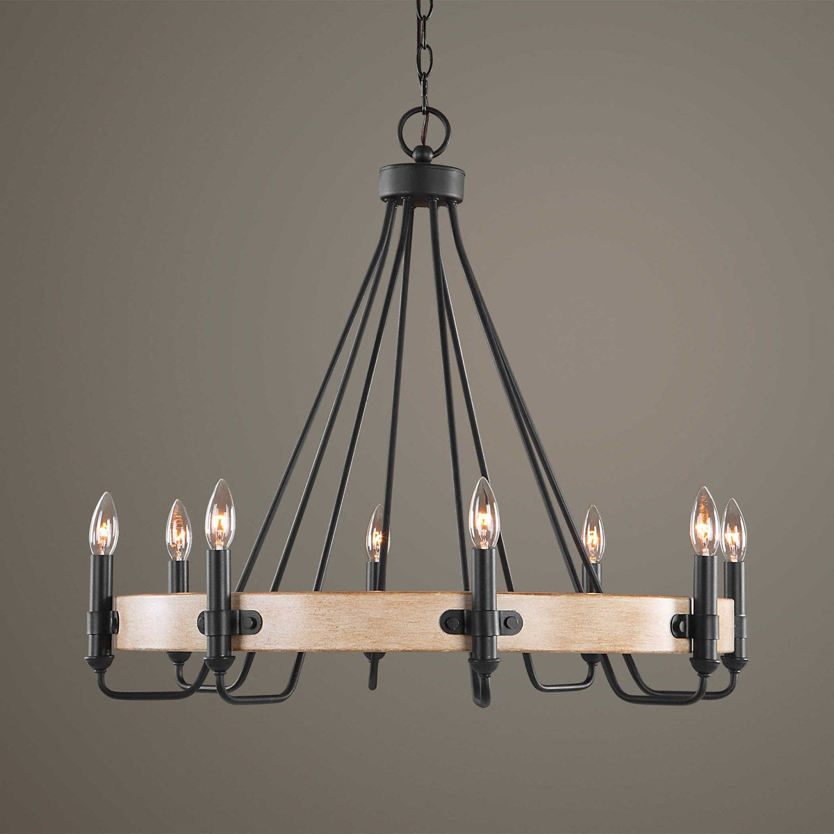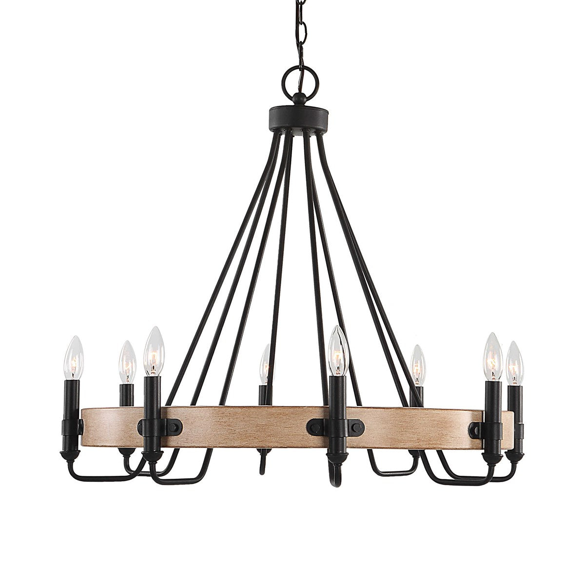 A warm rustic farmhouse feel with industrial flair is brought to life in The Deschutes 8-Light Chandelier featuring a sanded black metal cage finished with 8 candelabrasa bases mounted through a wood ring. The chandelier includes 12Ft. of wire and 5Ft. of chain for adjustable installation. Requires 8-60 watt candelabra bulbs.