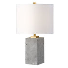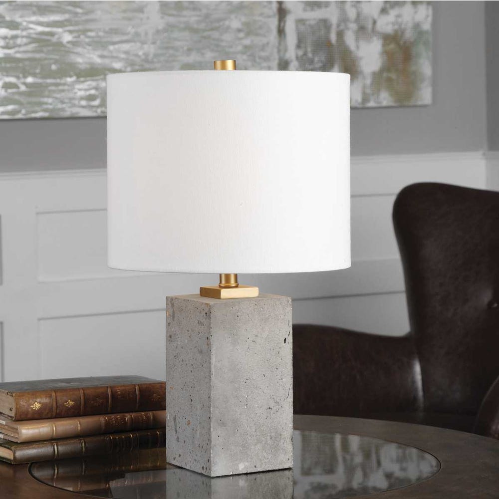 This Drexel Accent Lamp features a chunky block of airy, softly tinted concrete, highlighted by brushed gold-painted accents. It’s topped with a round hardback drum shade in crisp white linen fabric.