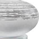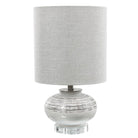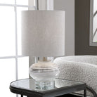 Inspired by the bark of a birch tree, this accent lamp features a ceramic base finished in off-white with dark bronze accents and noticeable texture and distressing. The piece also has a crystal foot and brushed nickel details. The lamp is paired with a light oatmeal linen fabric shade.